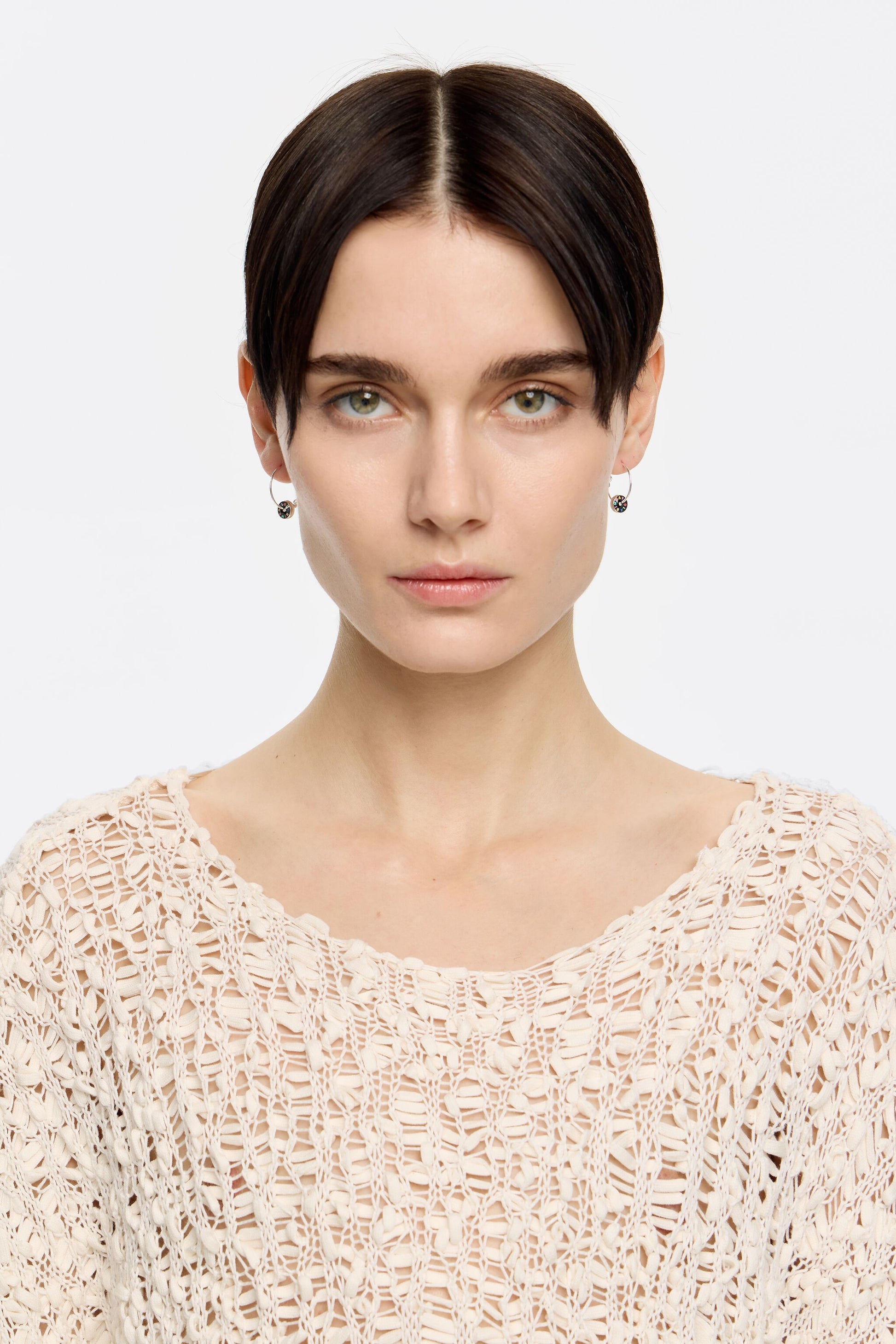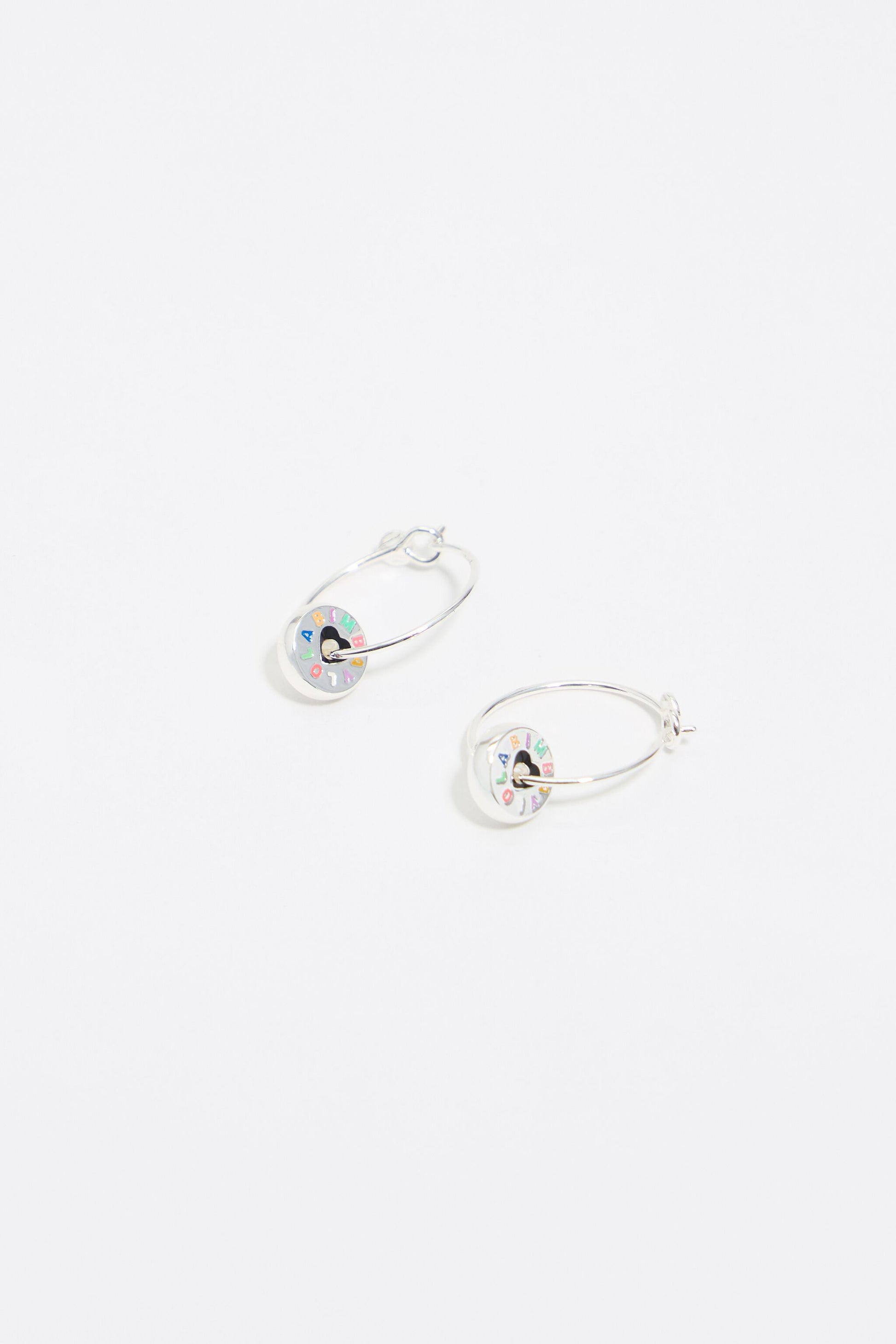 Silver tone metal hoop earrings with multicolor heart logo pendants. Model customized with engraved logo.