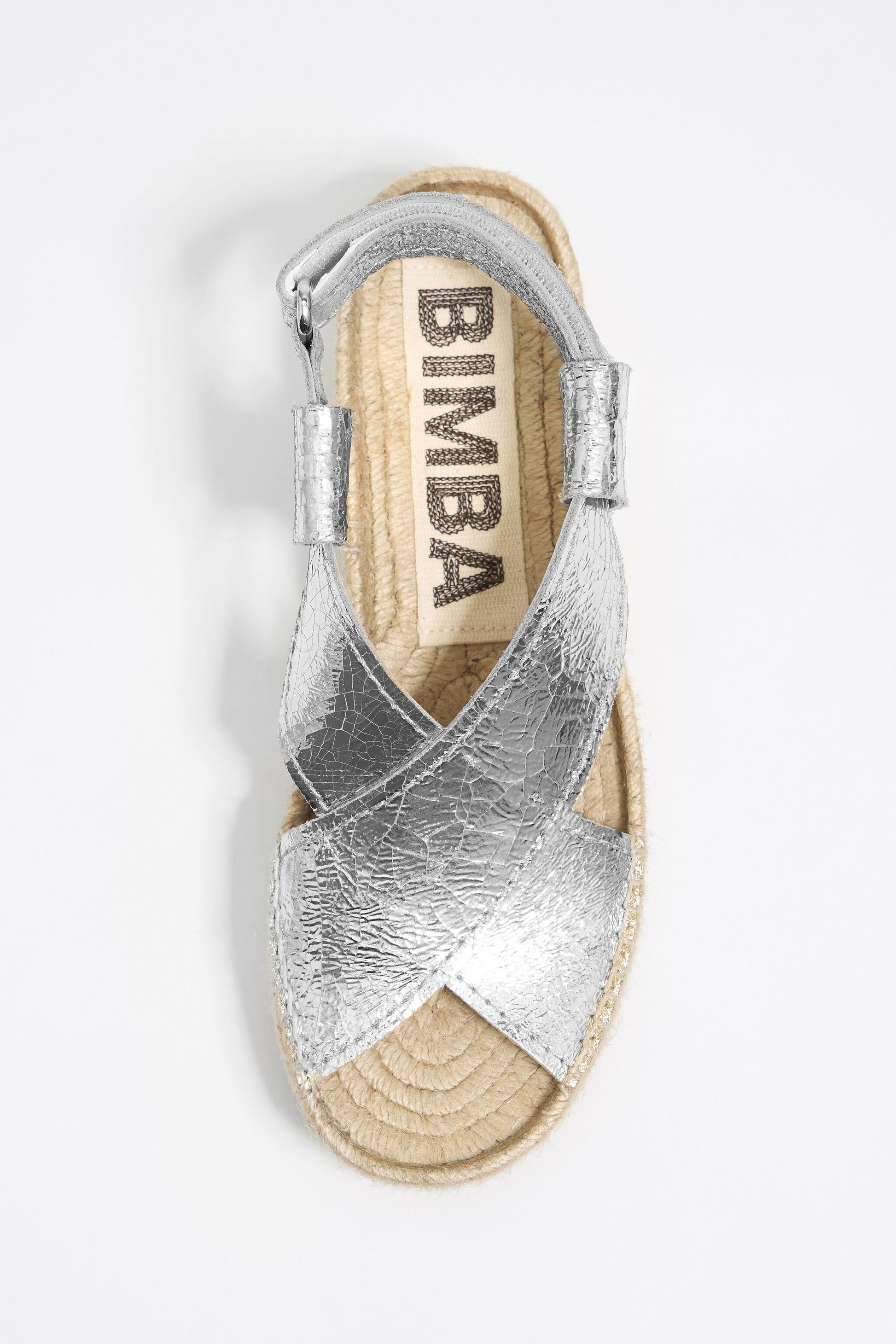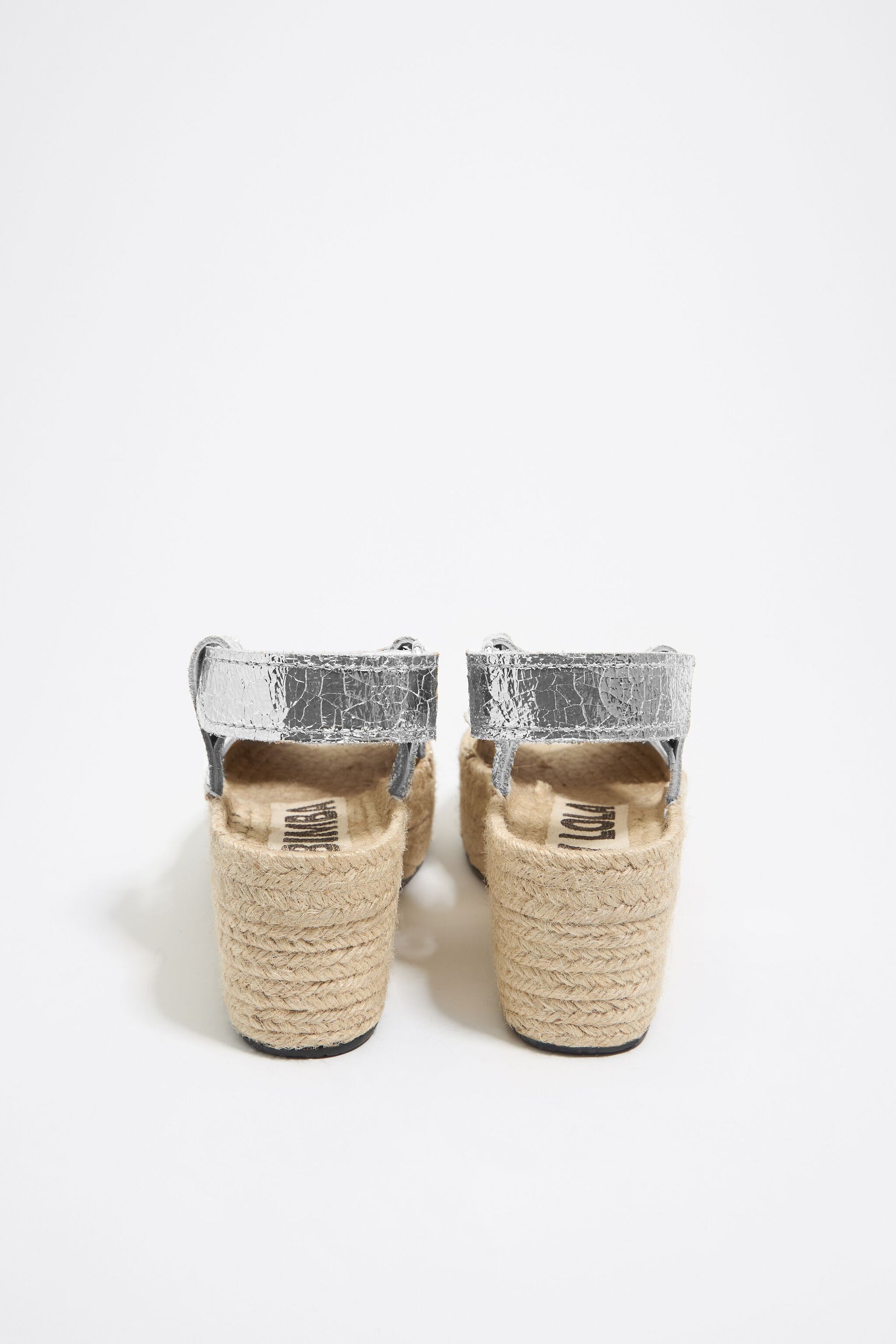 Leather high jute wedge sandal in silver. Crossed strap model with back velcro fastener. Label with embroidered logo on the insole and customized jute platform sole.