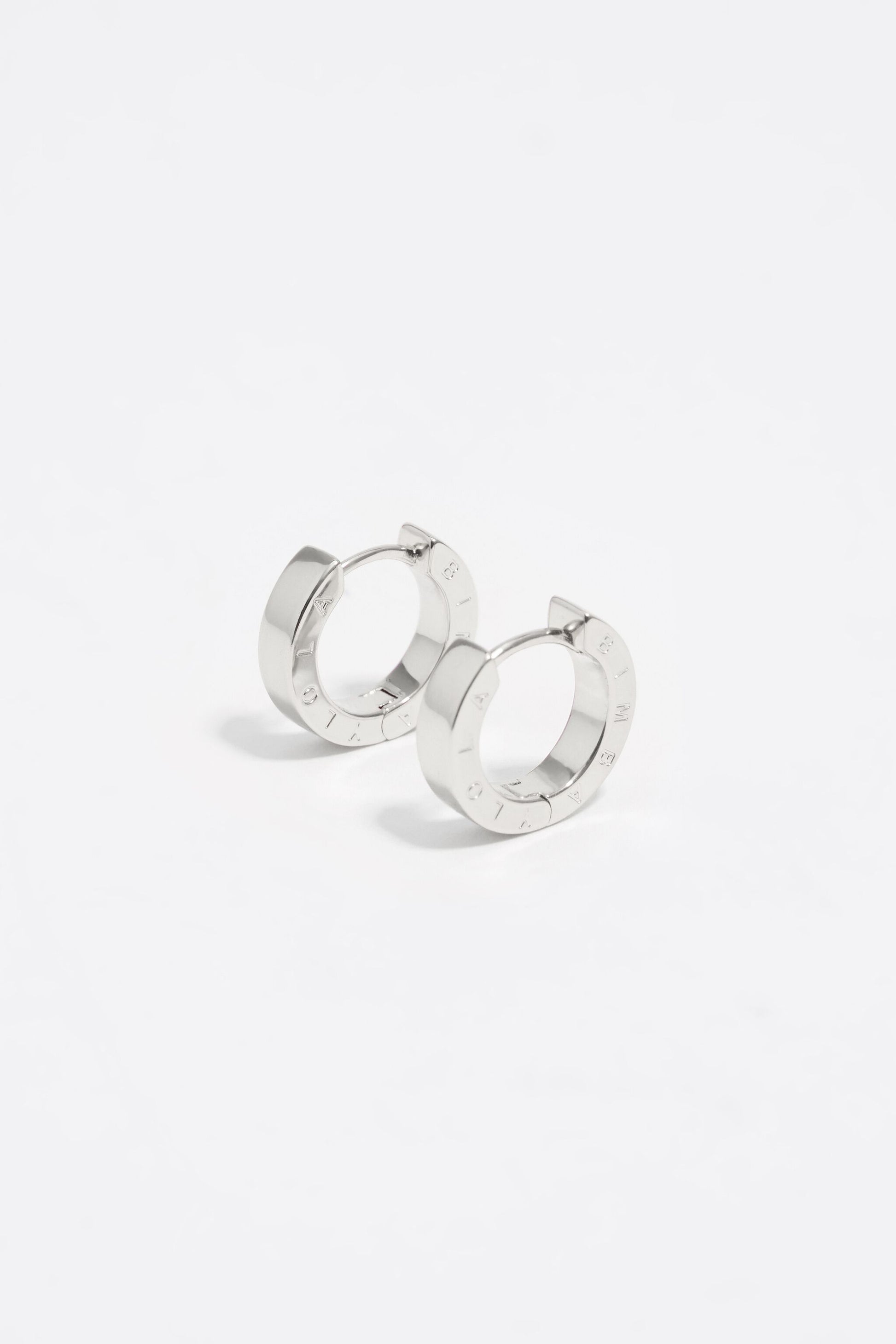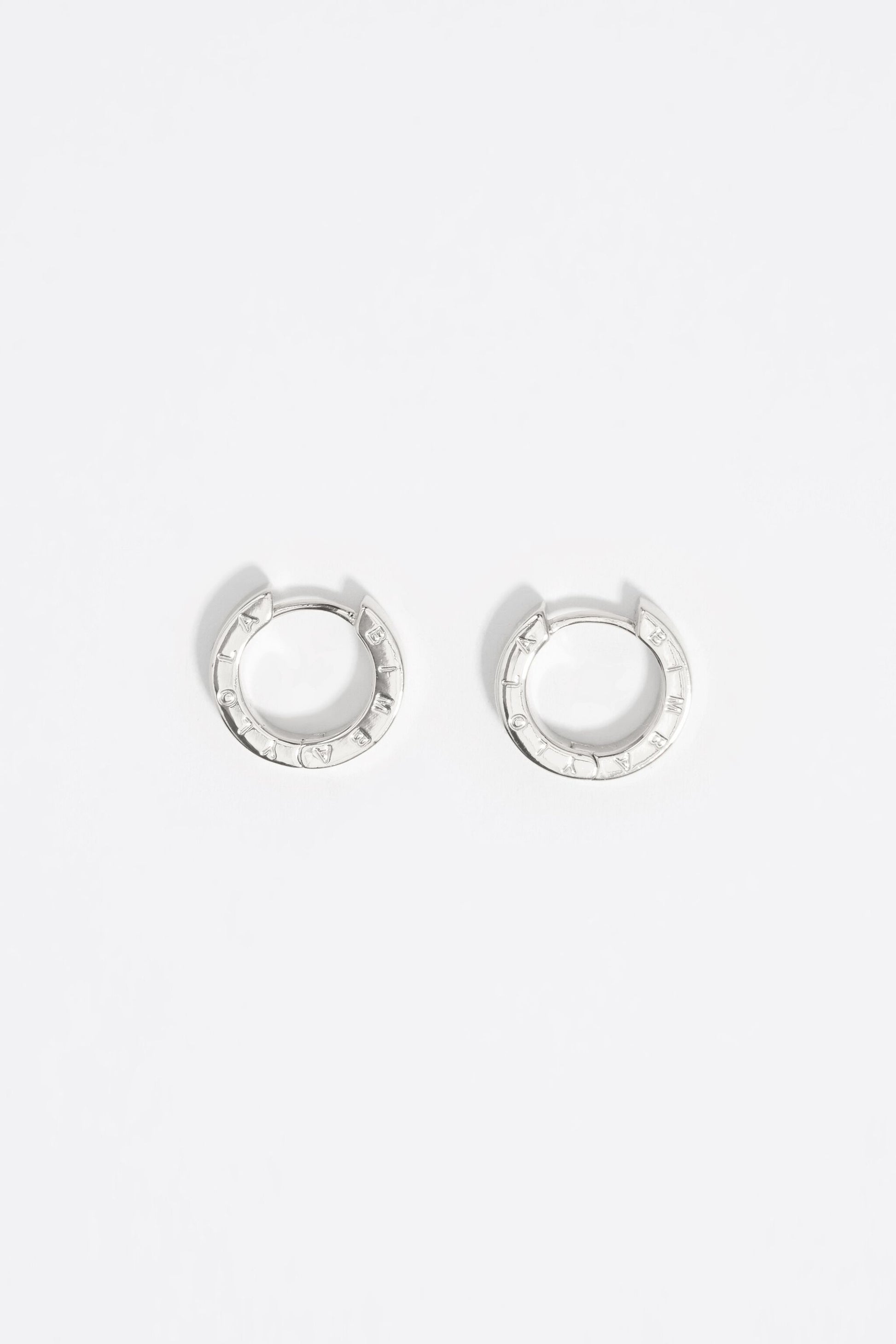 Silver metal hoop earrings with logo. Model customized with engraved logo.