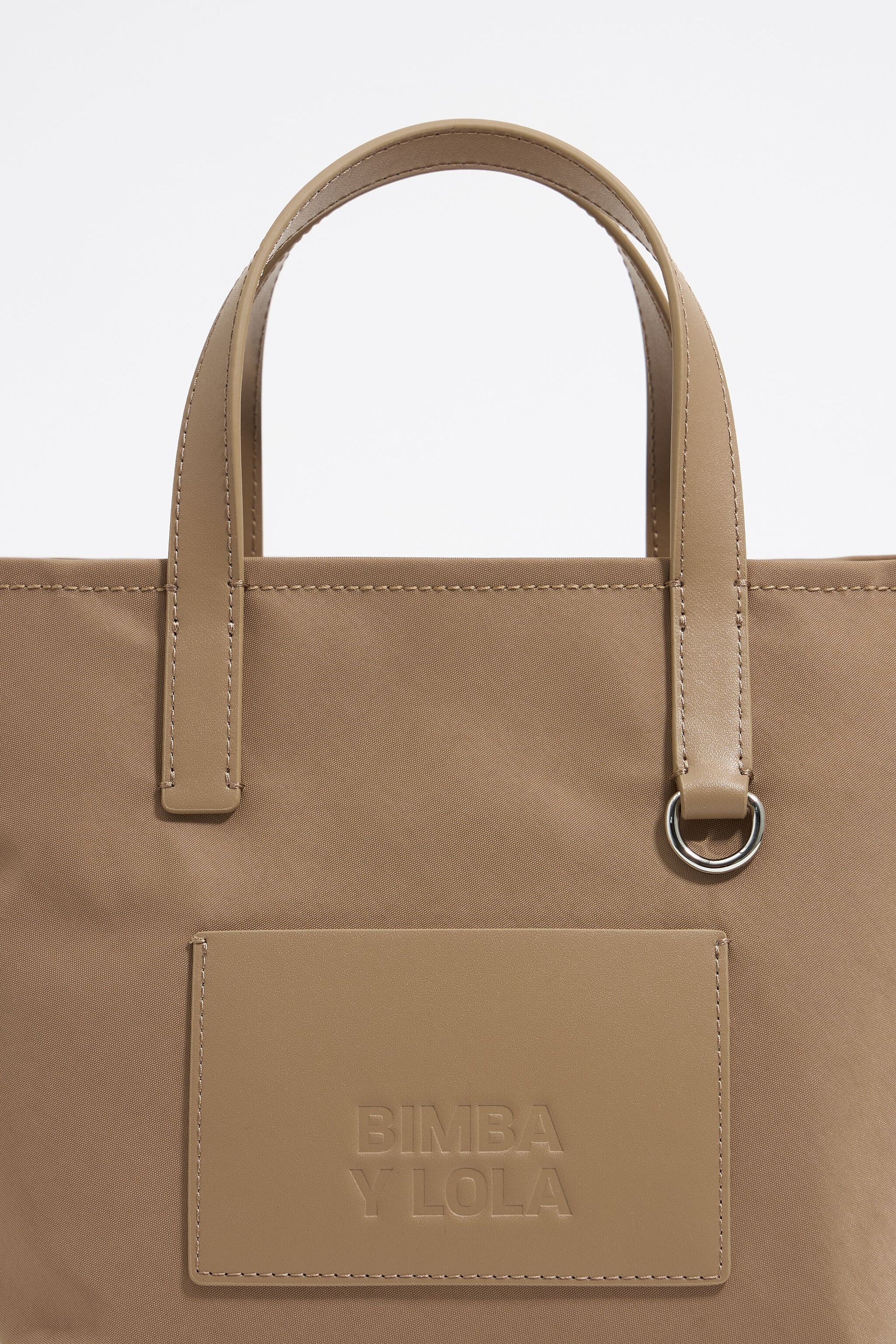 Nylon crossbody bag in bark brown. Small model, with a lobster clasp and zip fastener, a leather handle, fabric strap, and leather pieces on a handle, a base and fabric strap. Exterior customized with engraved leather logo.