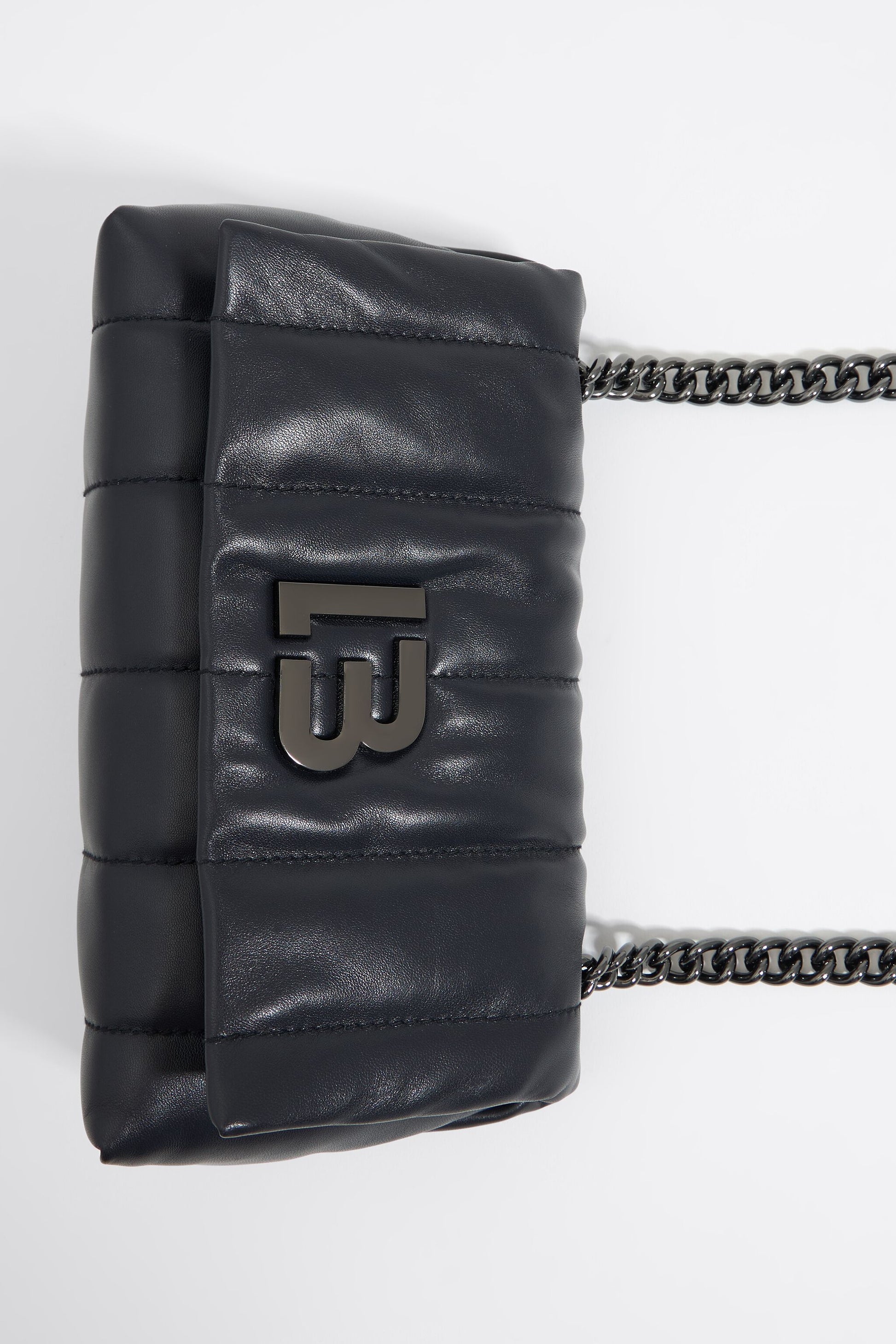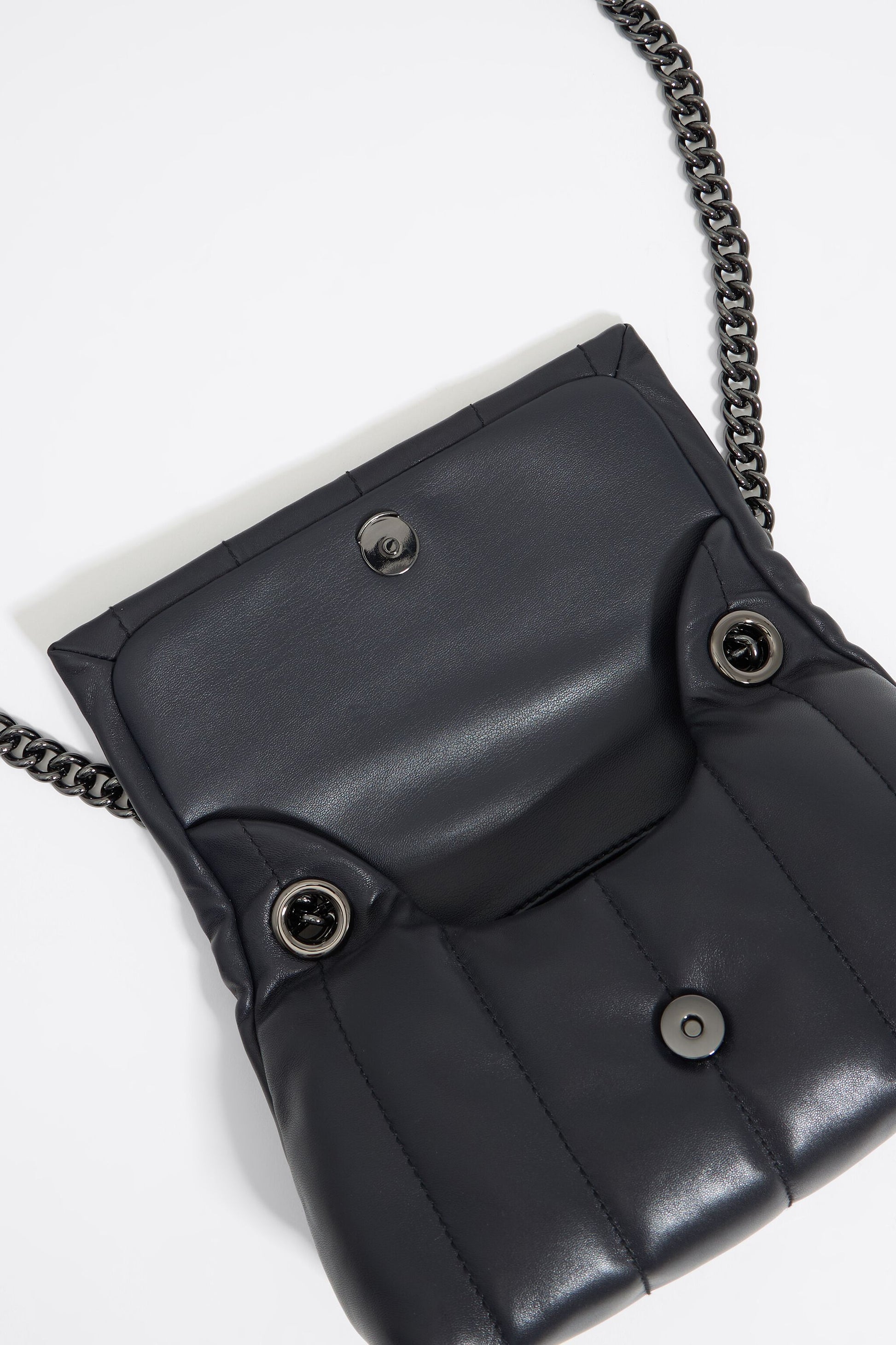 Leather flap bag in black. Small model with magnetic fastener, long chain and leather strap, and interior pocket. Exterior customized with metallic logo.