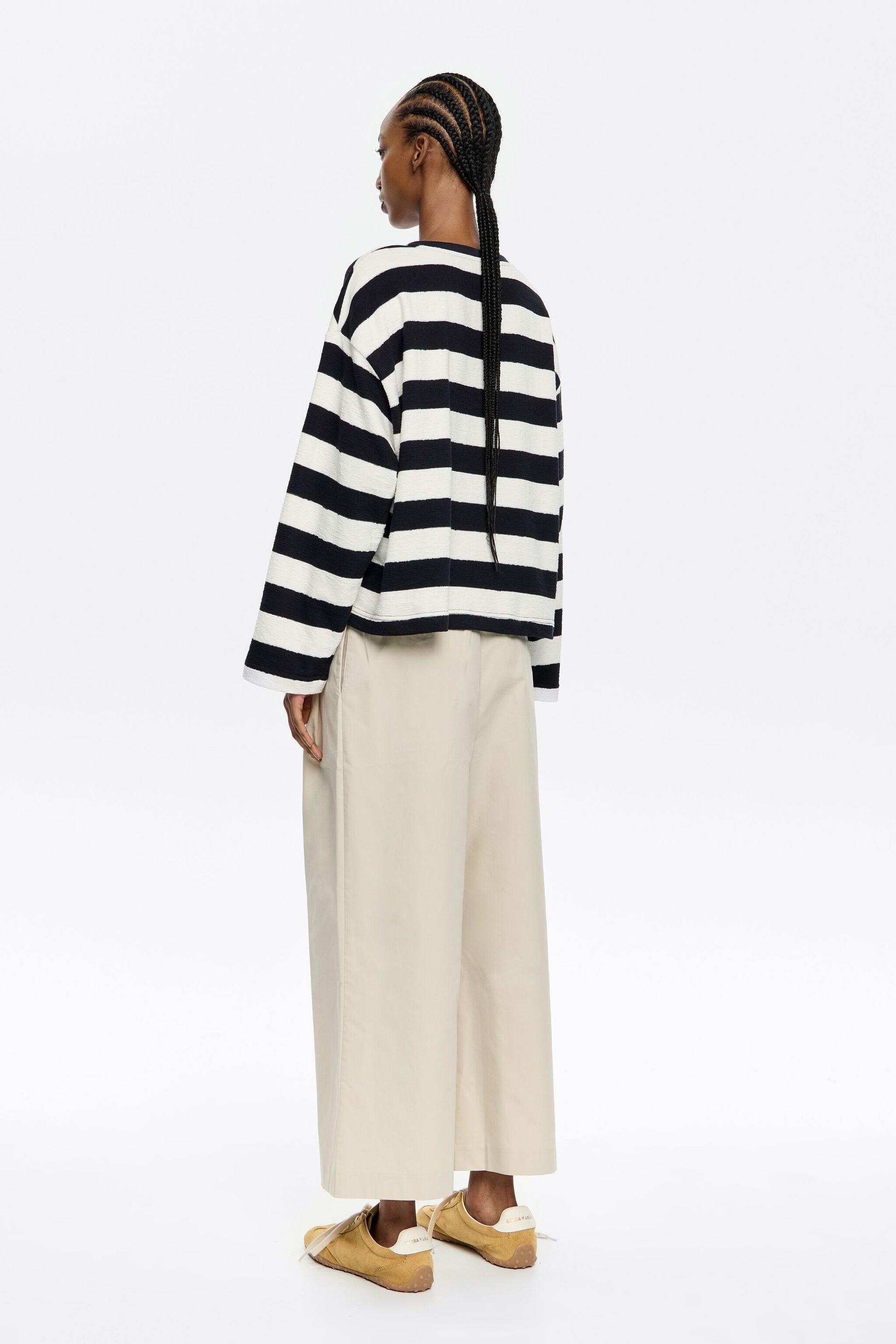 Cotton ankle-length trousers in stone. Straight cut, with concealed front hook-and-eye and zip fastener. Front darts and fabric loops. Slash pockets and welt back pockets.