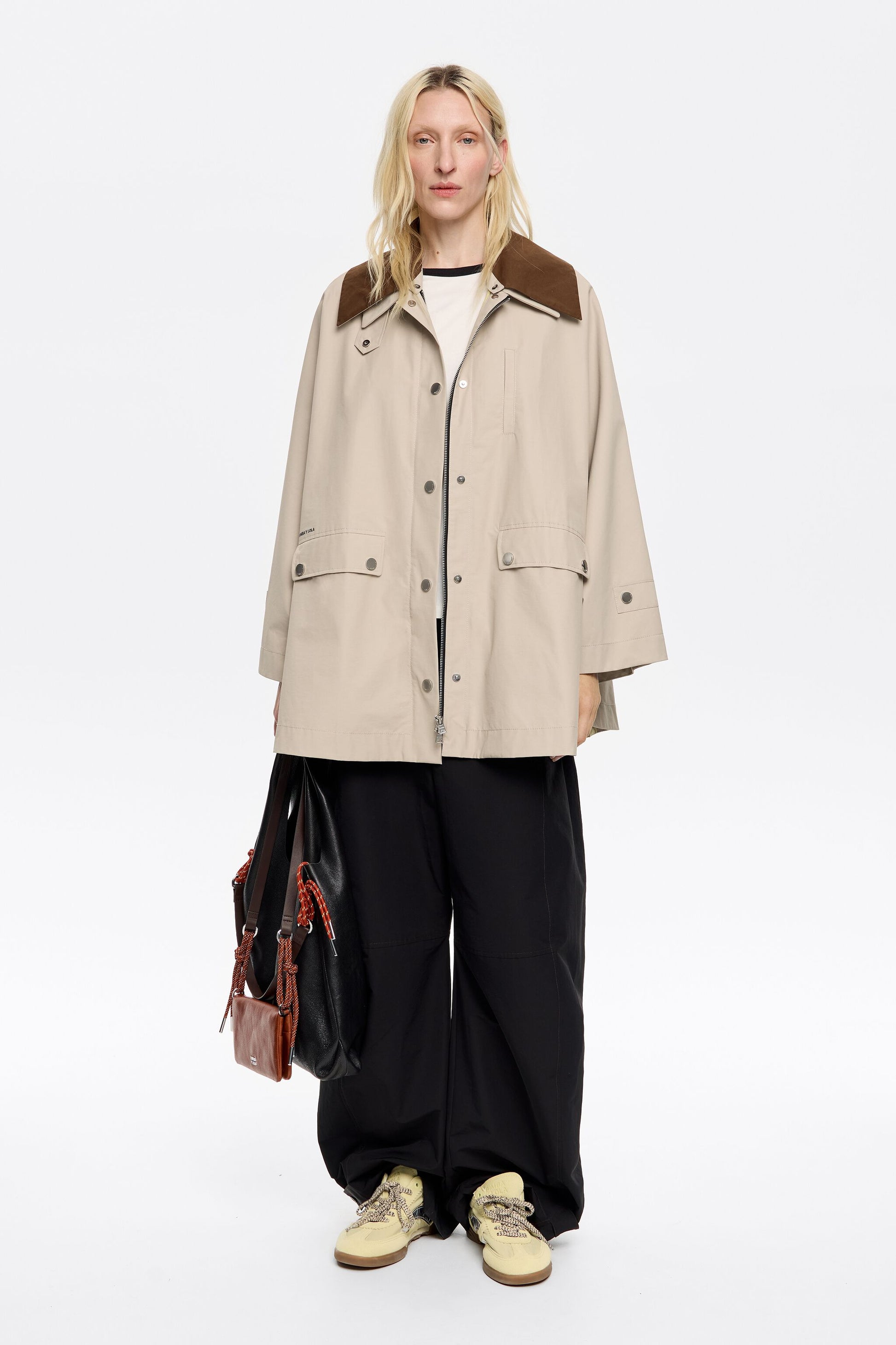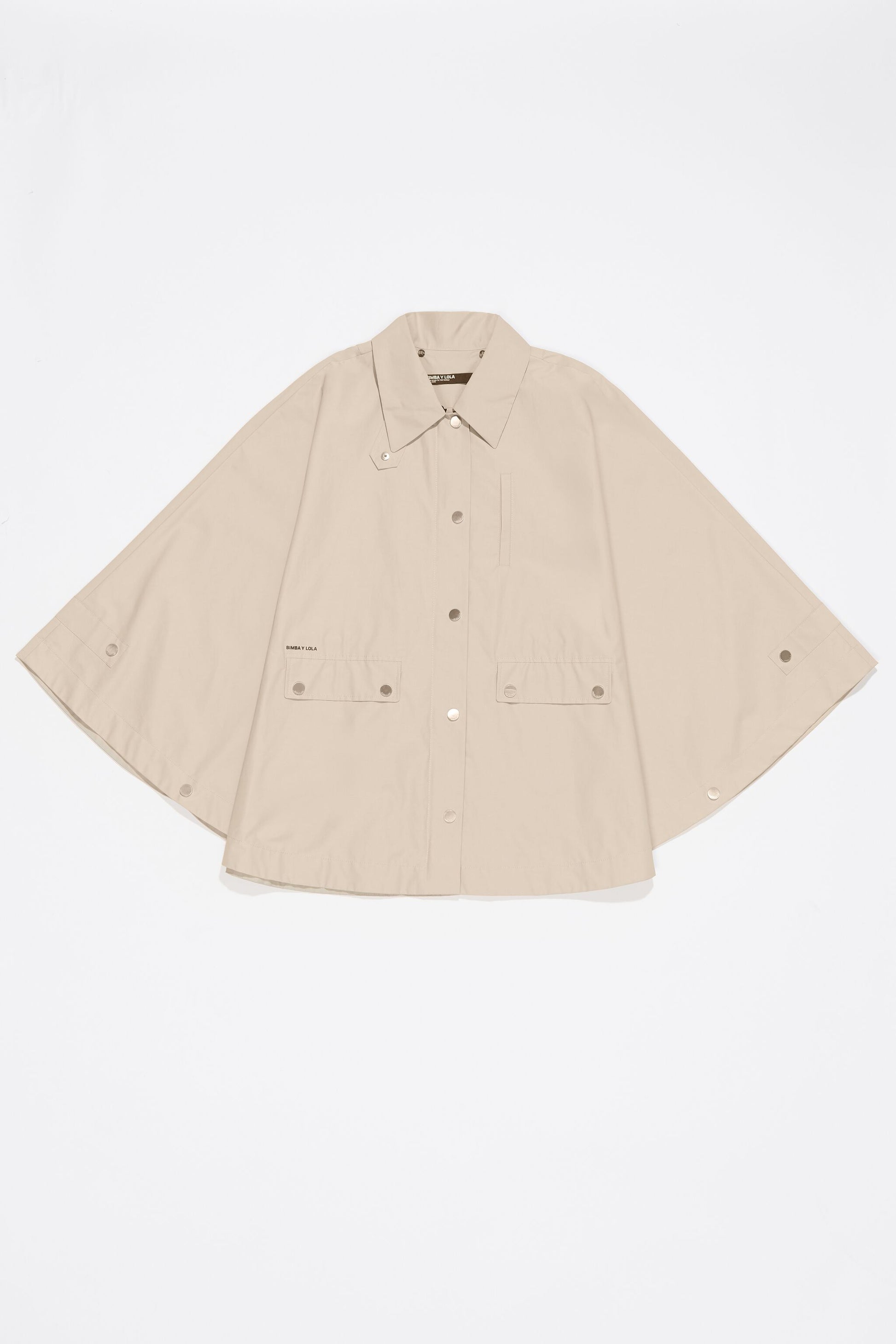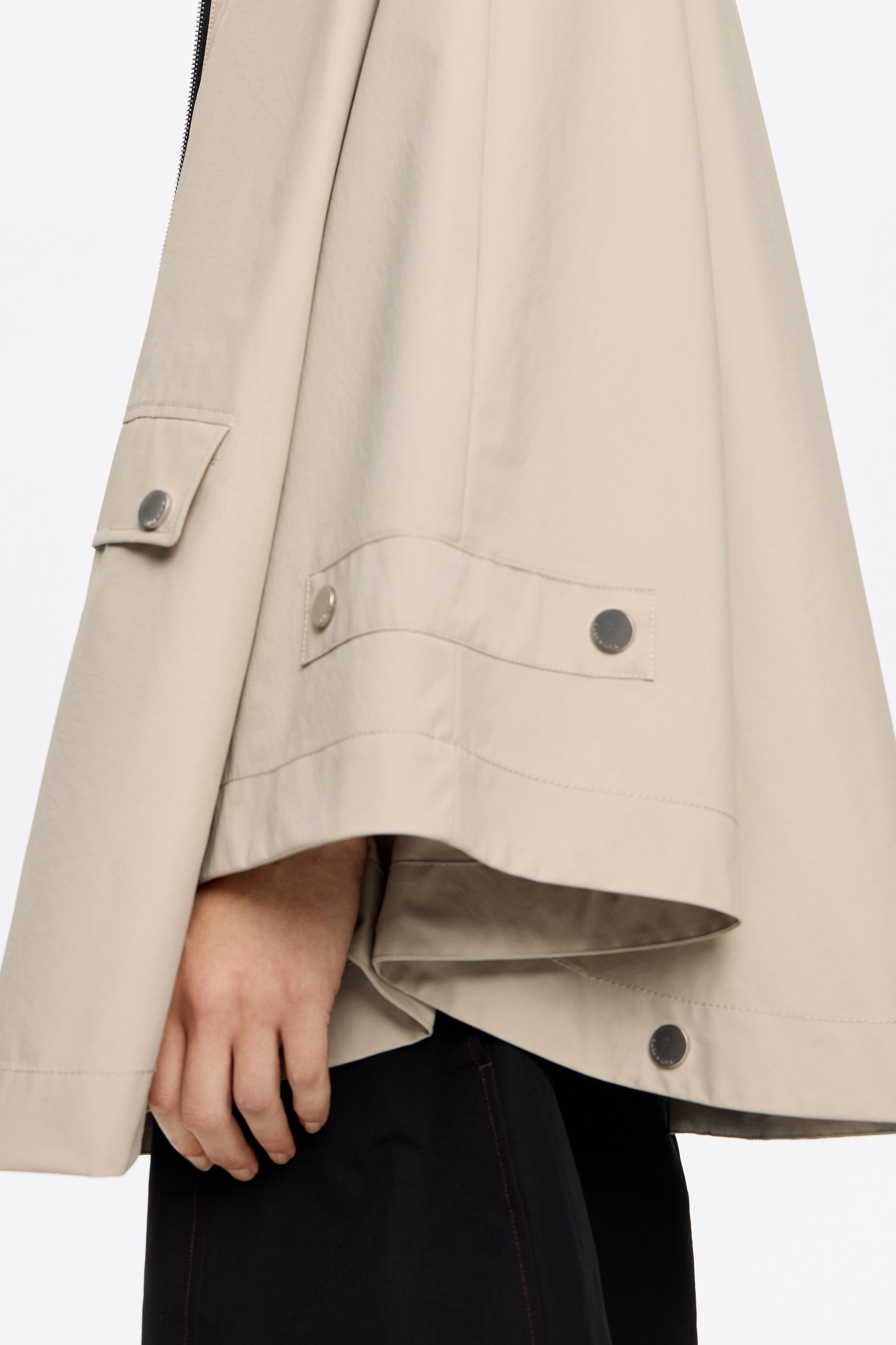 Technical cotton cape in stone. Oversize cut, contrast detachable collar and button-up front with press-studs. Exterior customized with logo print. This model contains 25% recycled polyamide.