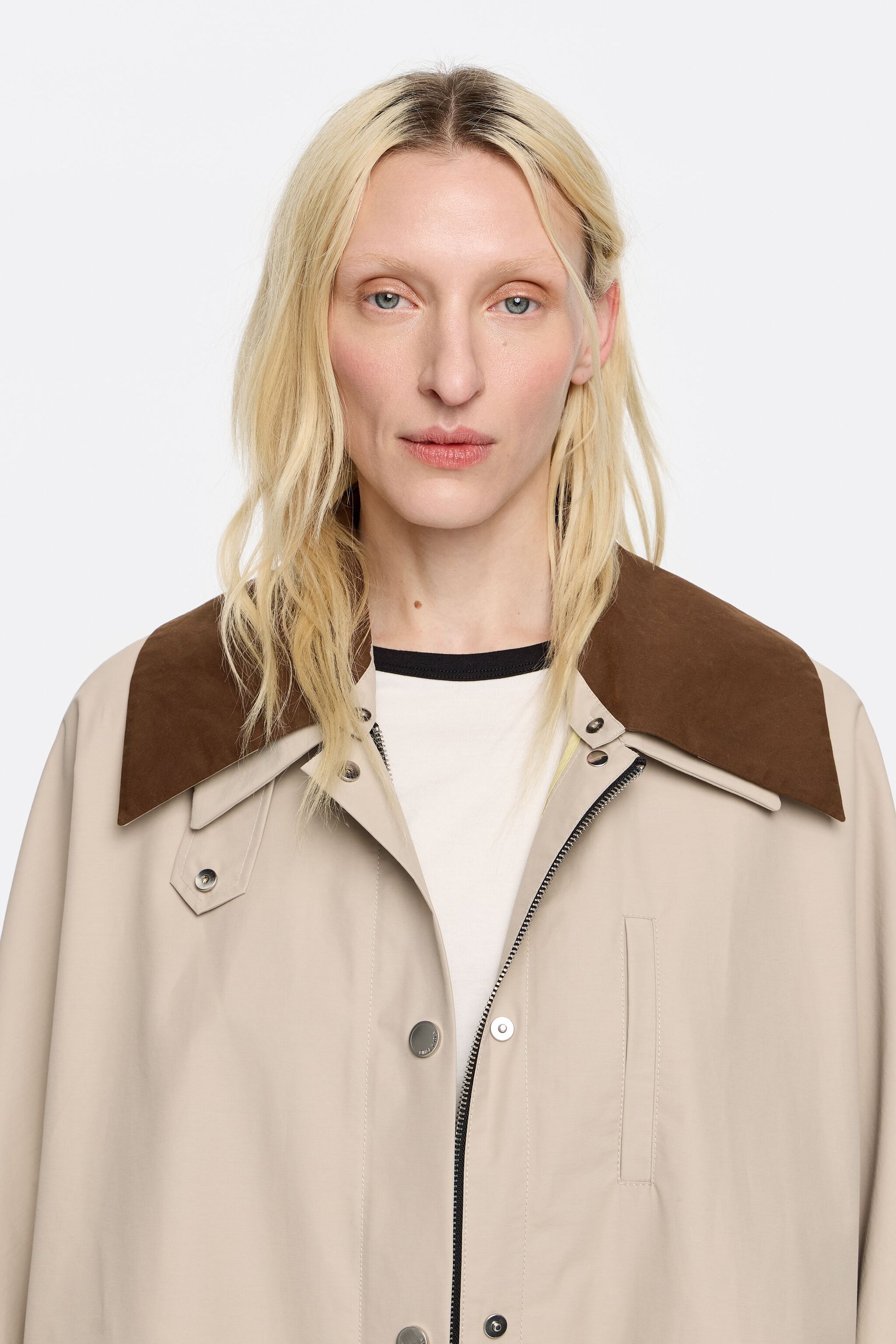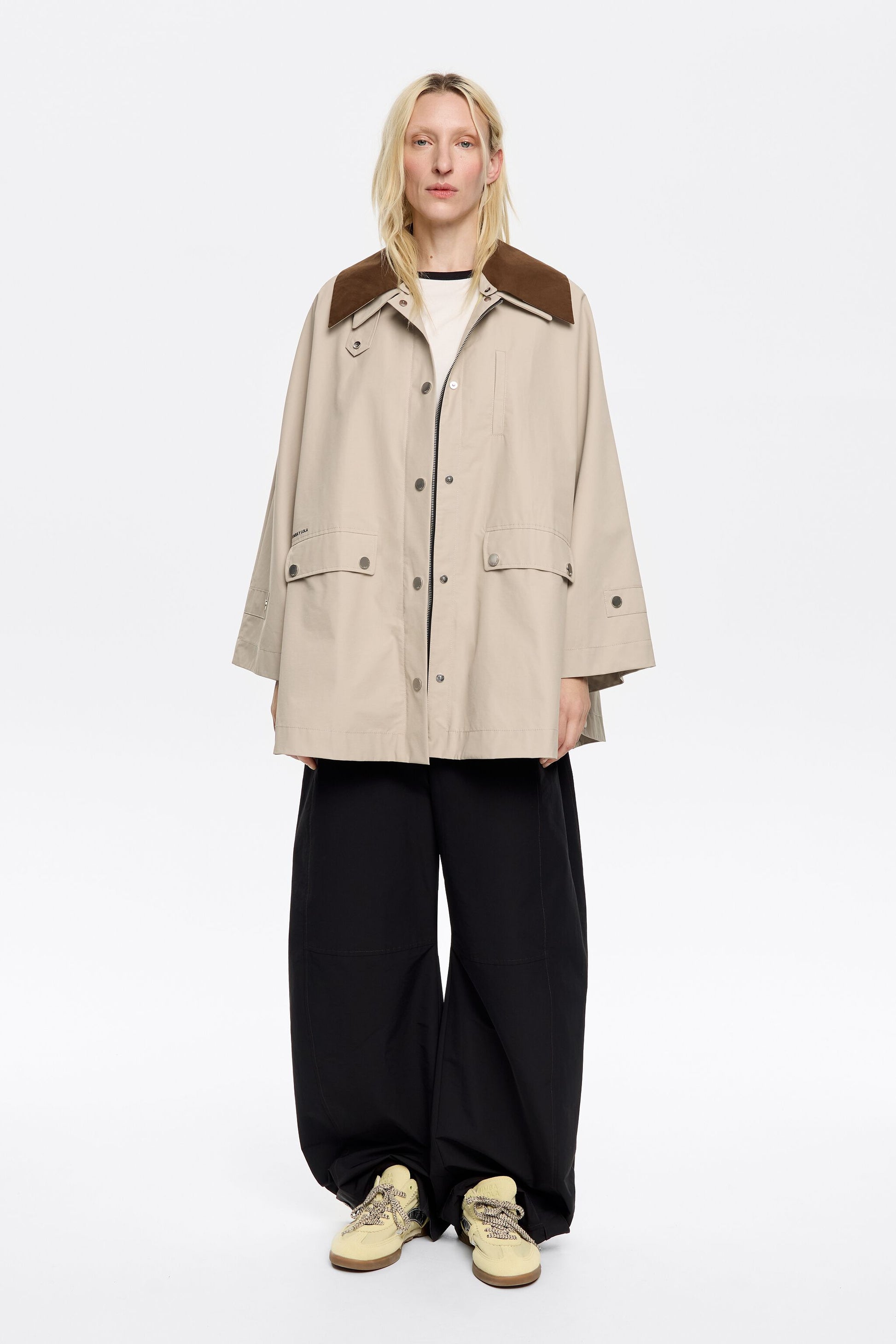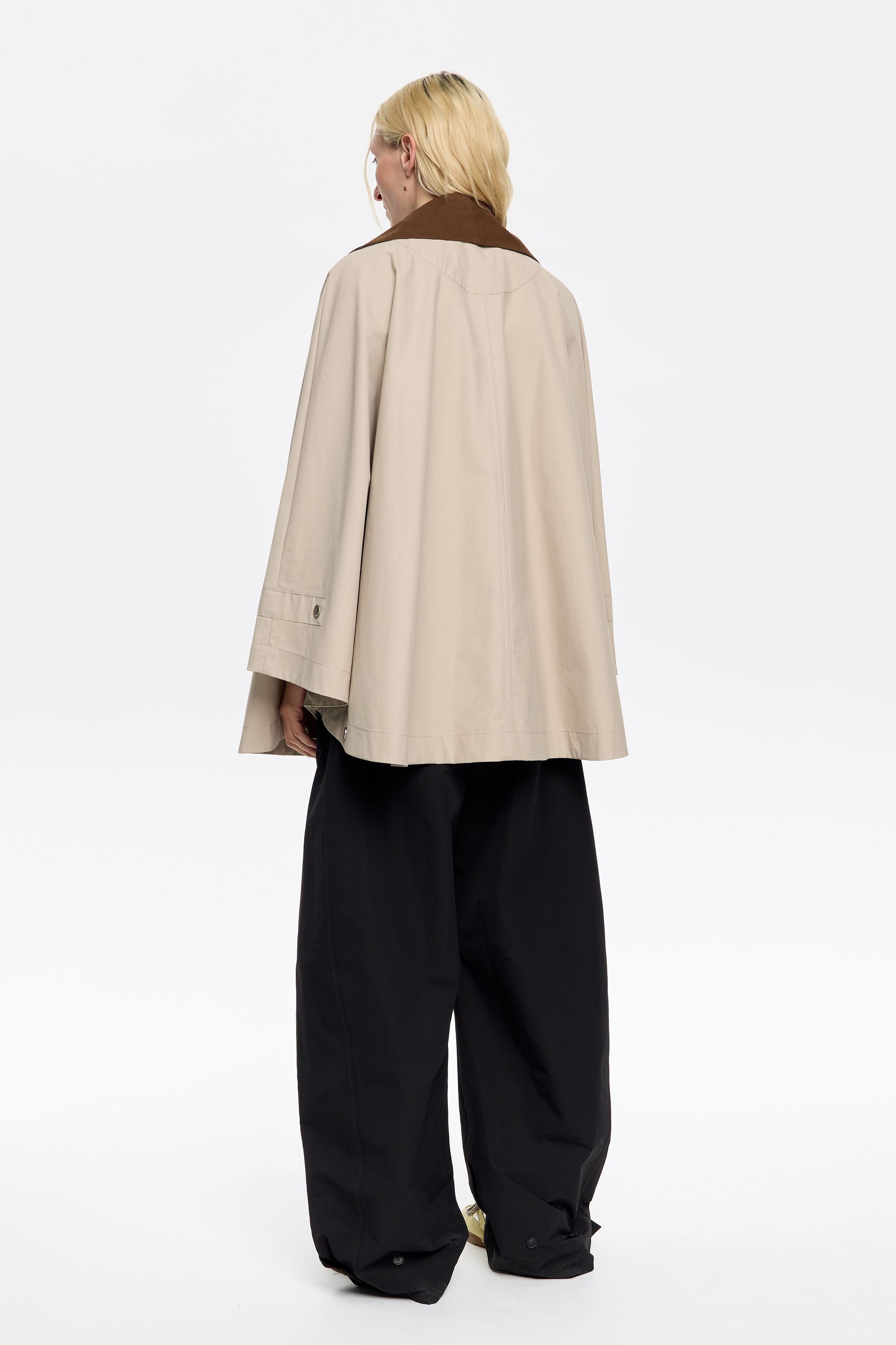 Technical cotton cape in stone. Oversize cut, contrast detachable collar and button-up front with press-studs. Exterior customized with logo print. This model contains 25% recycled polyamide.