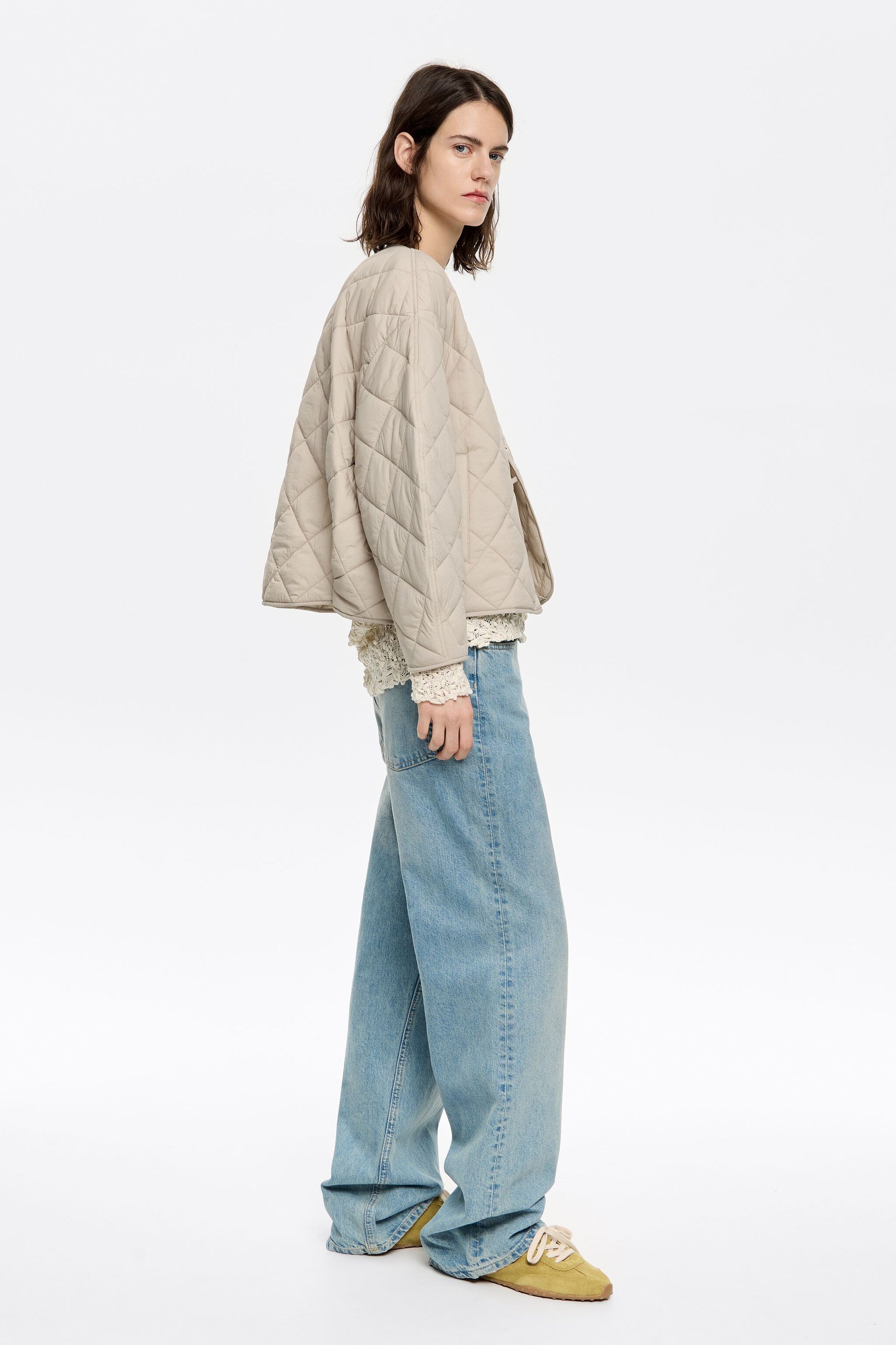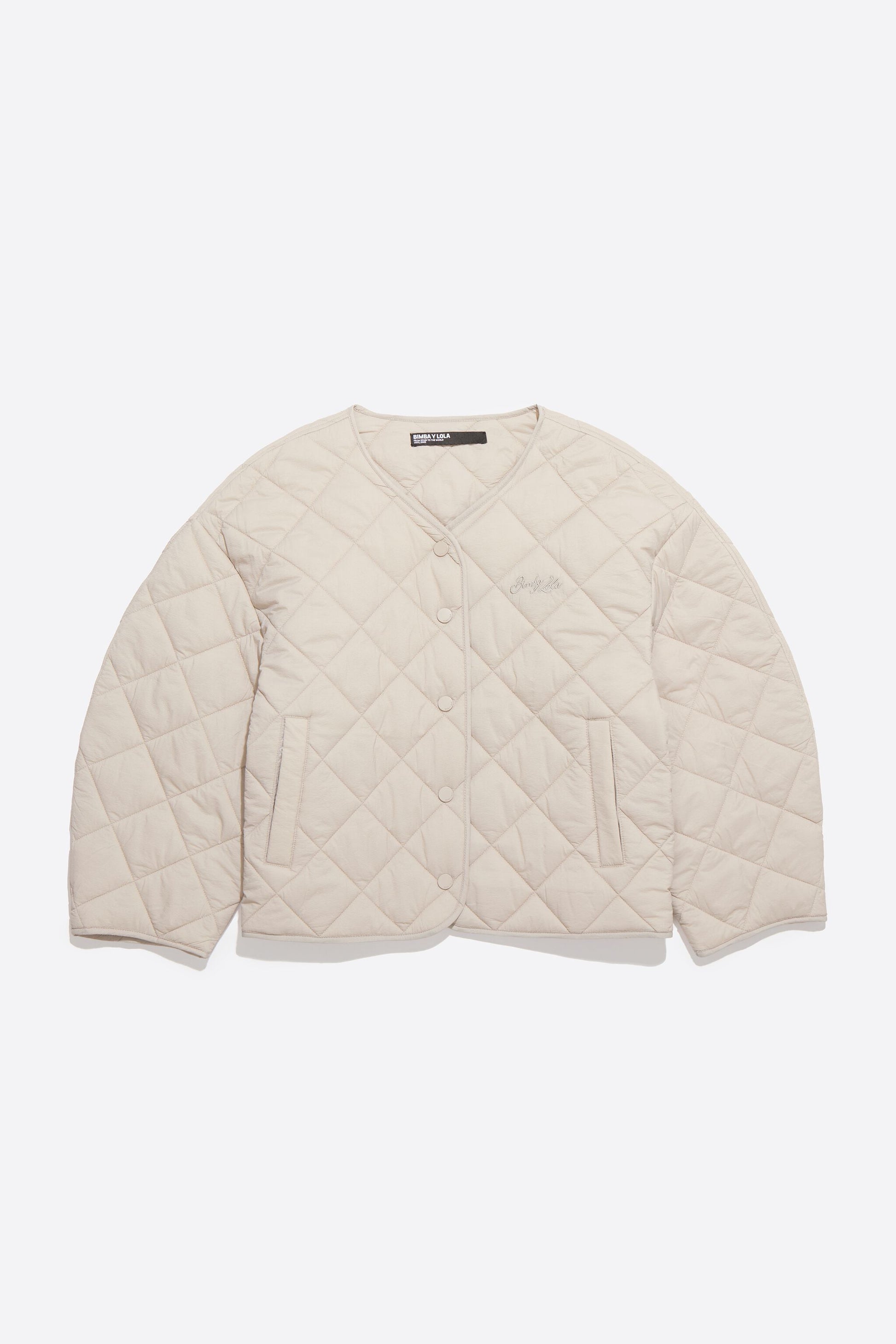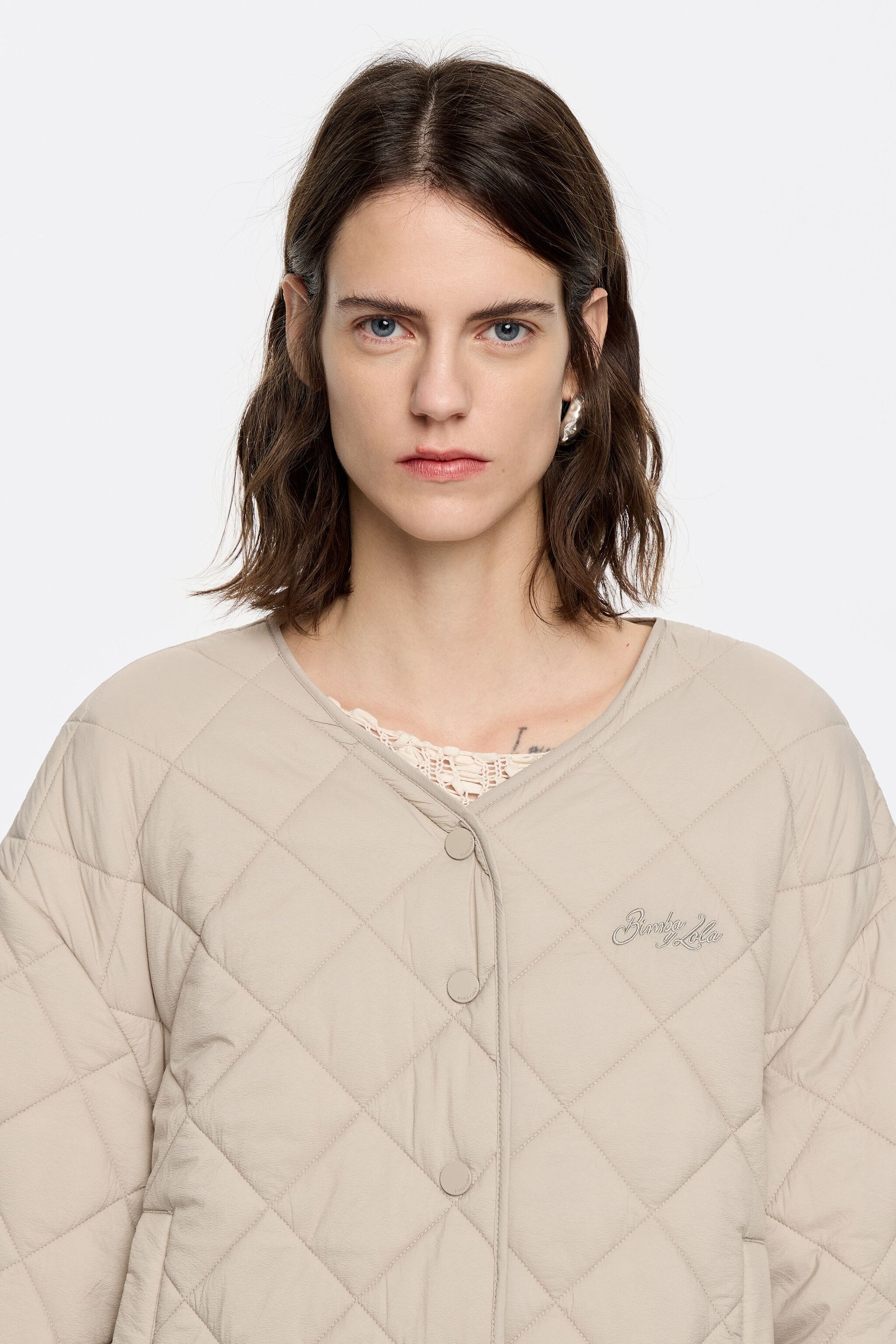 Short padded technical fabric jacket in stone. With rounded V-neck, long voluminous sleeve and front press-stud fastening. Piped pockets, adjustable hem with press-studs and exterior customized with embroidered logo.