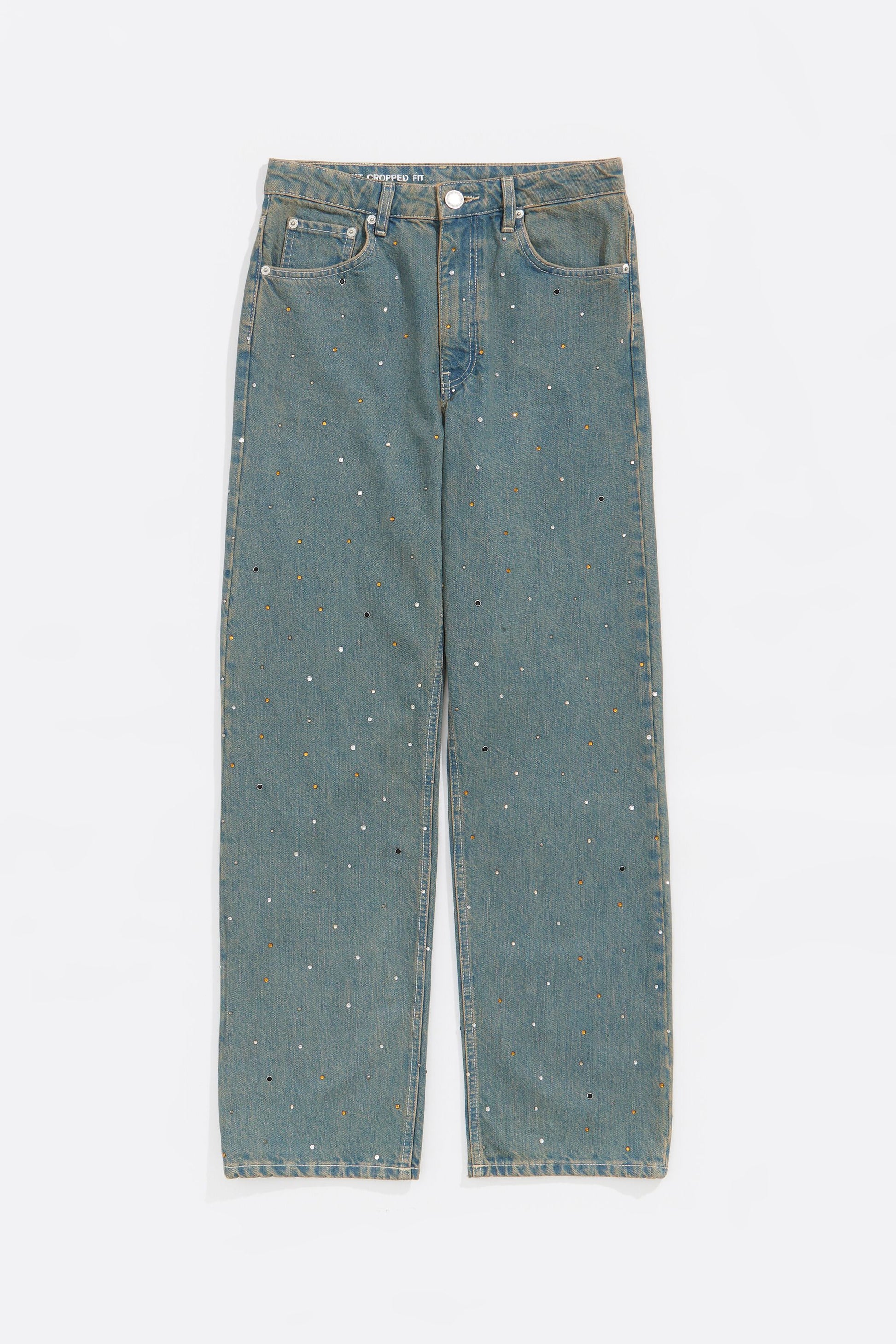 Jeans in light blue. Straight, cropped high rise design with front jeans button fastening, five pockets and all-over stones. This model contains 20% recycled fibers.