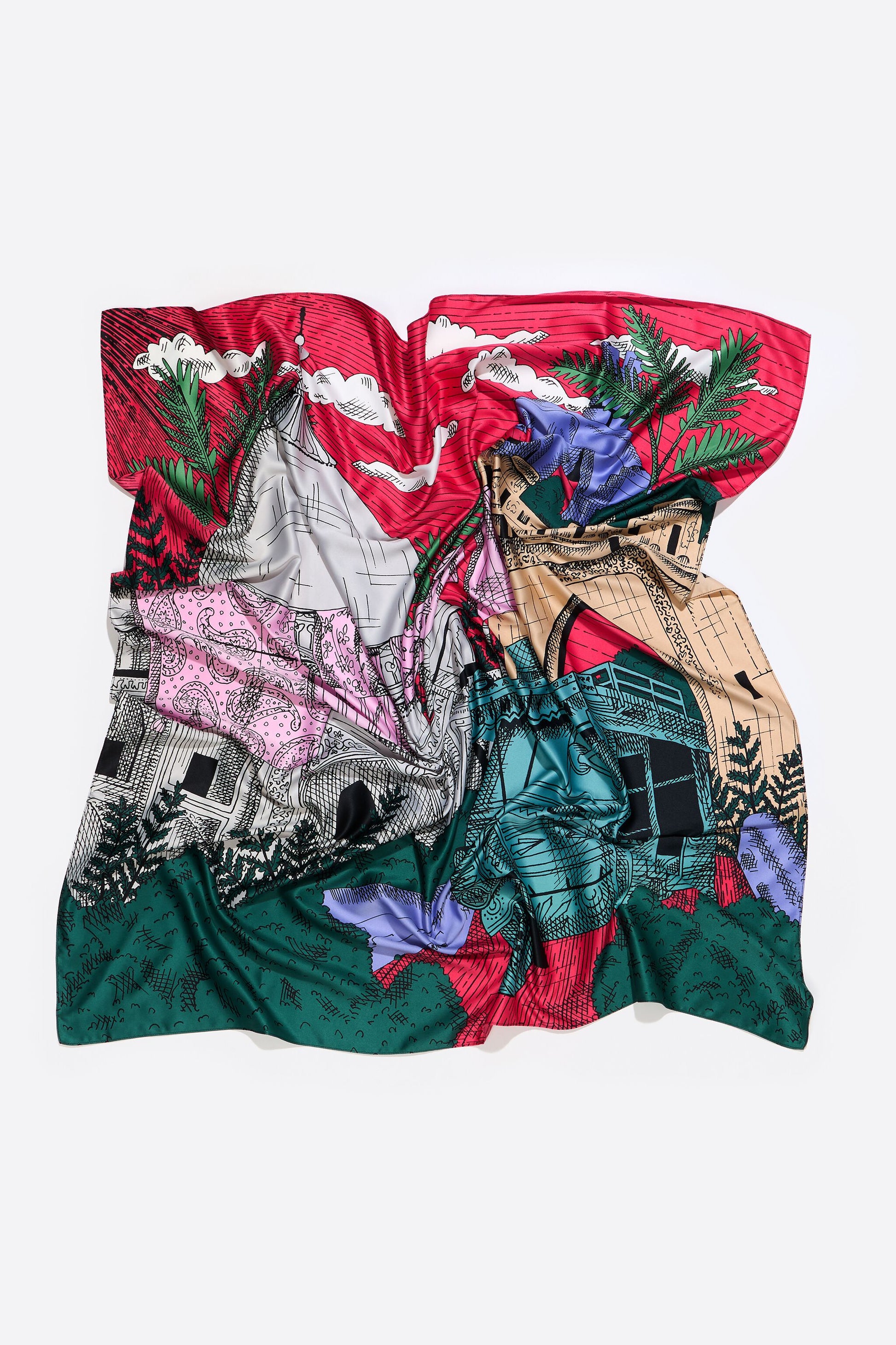 Scarf with Indian city print on a strawberry background. 100% Recycled polyester.