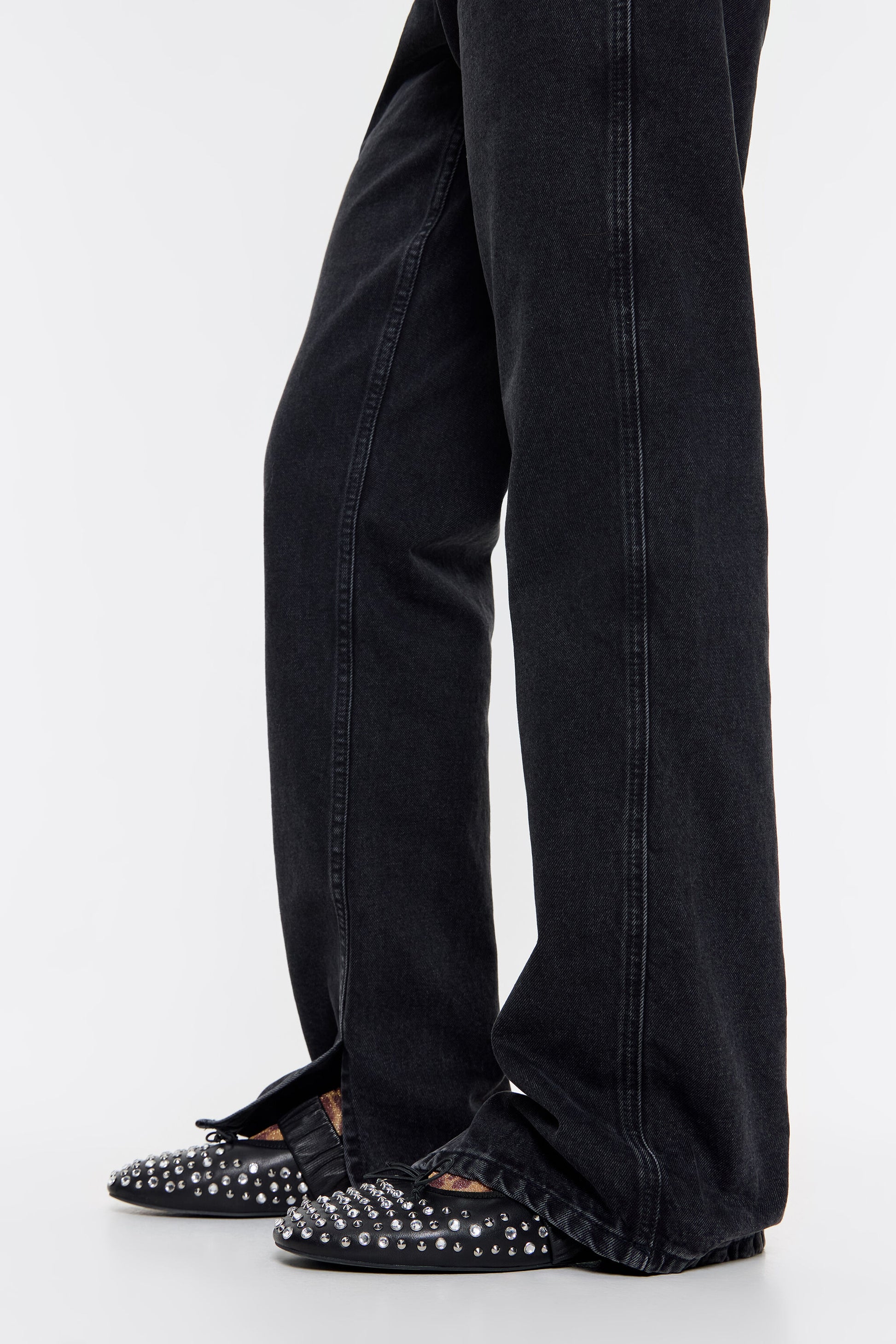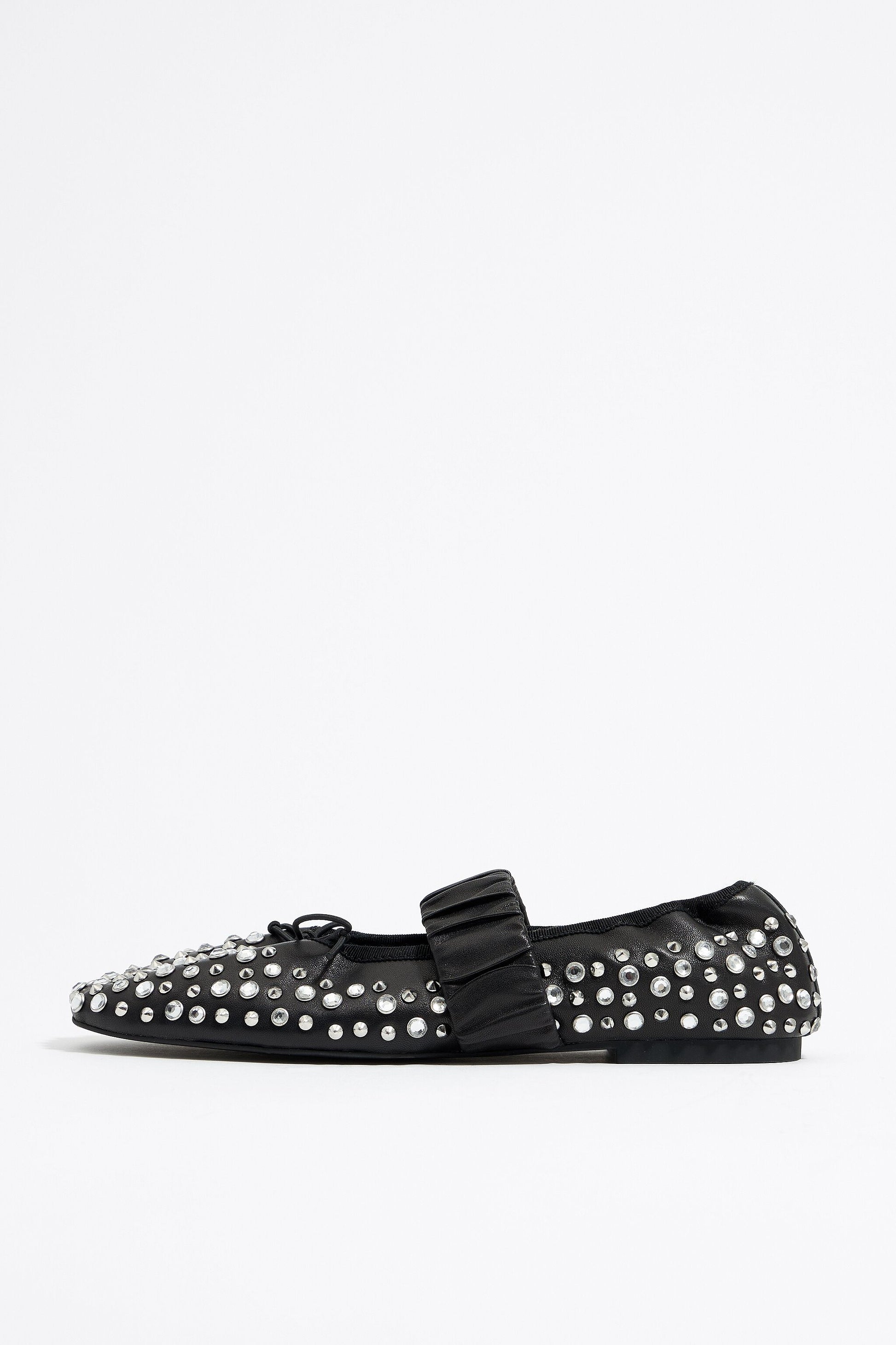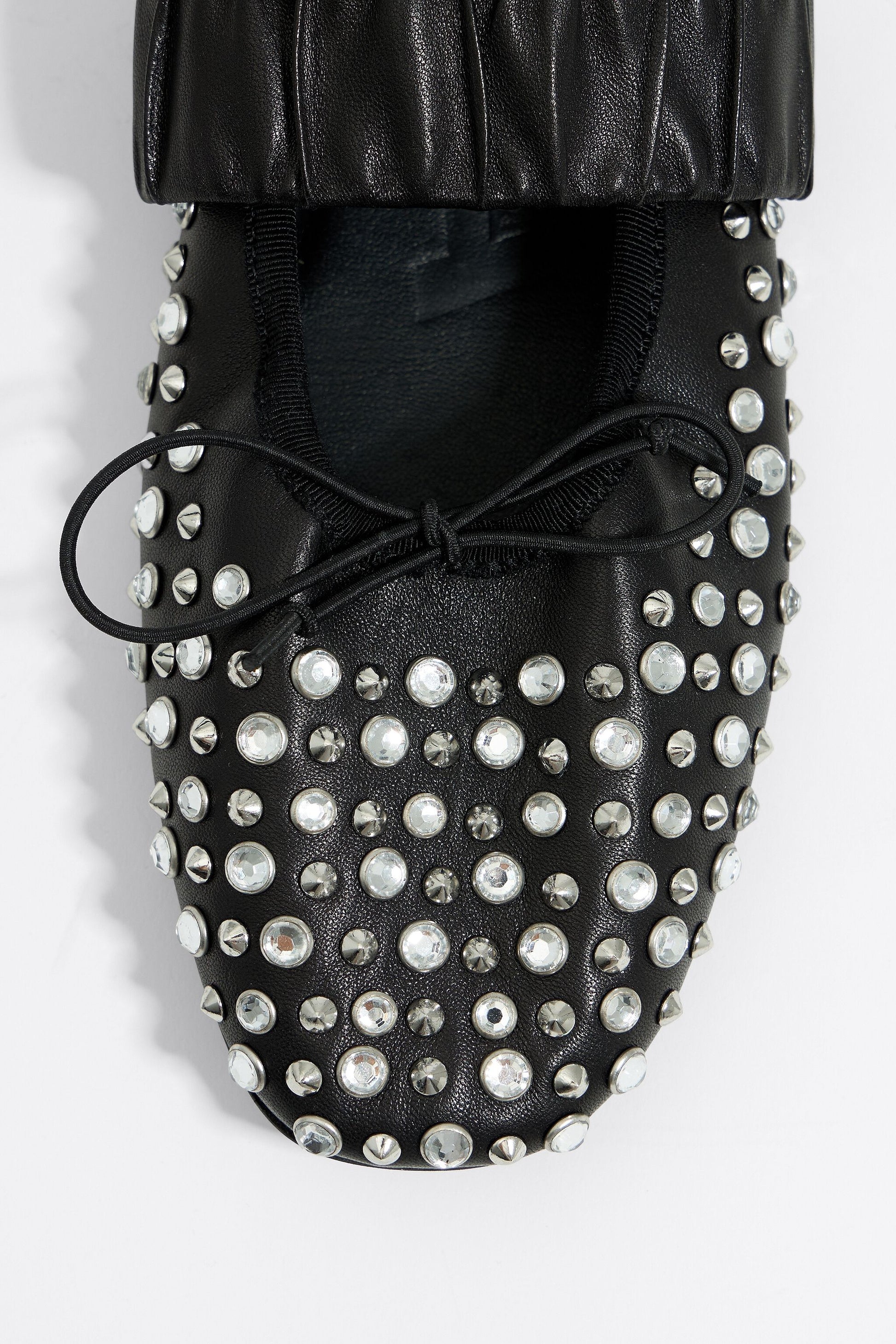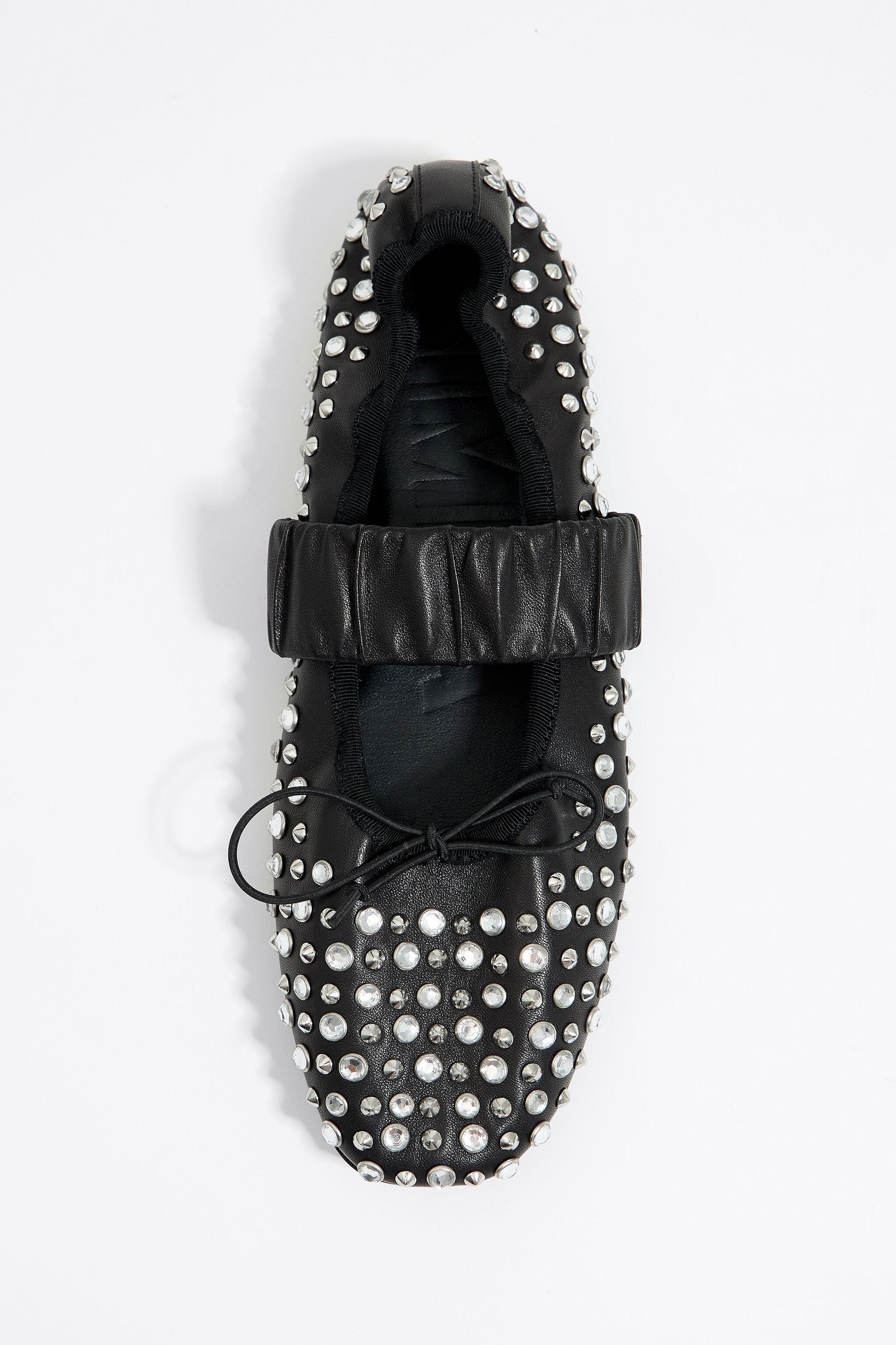 Black leather ballerina with studs. Rounded toe with a leather ankle strap, V-shape vamp with stretch bow and studs with pointed crystals. Insole with engraved logo and logo sole.