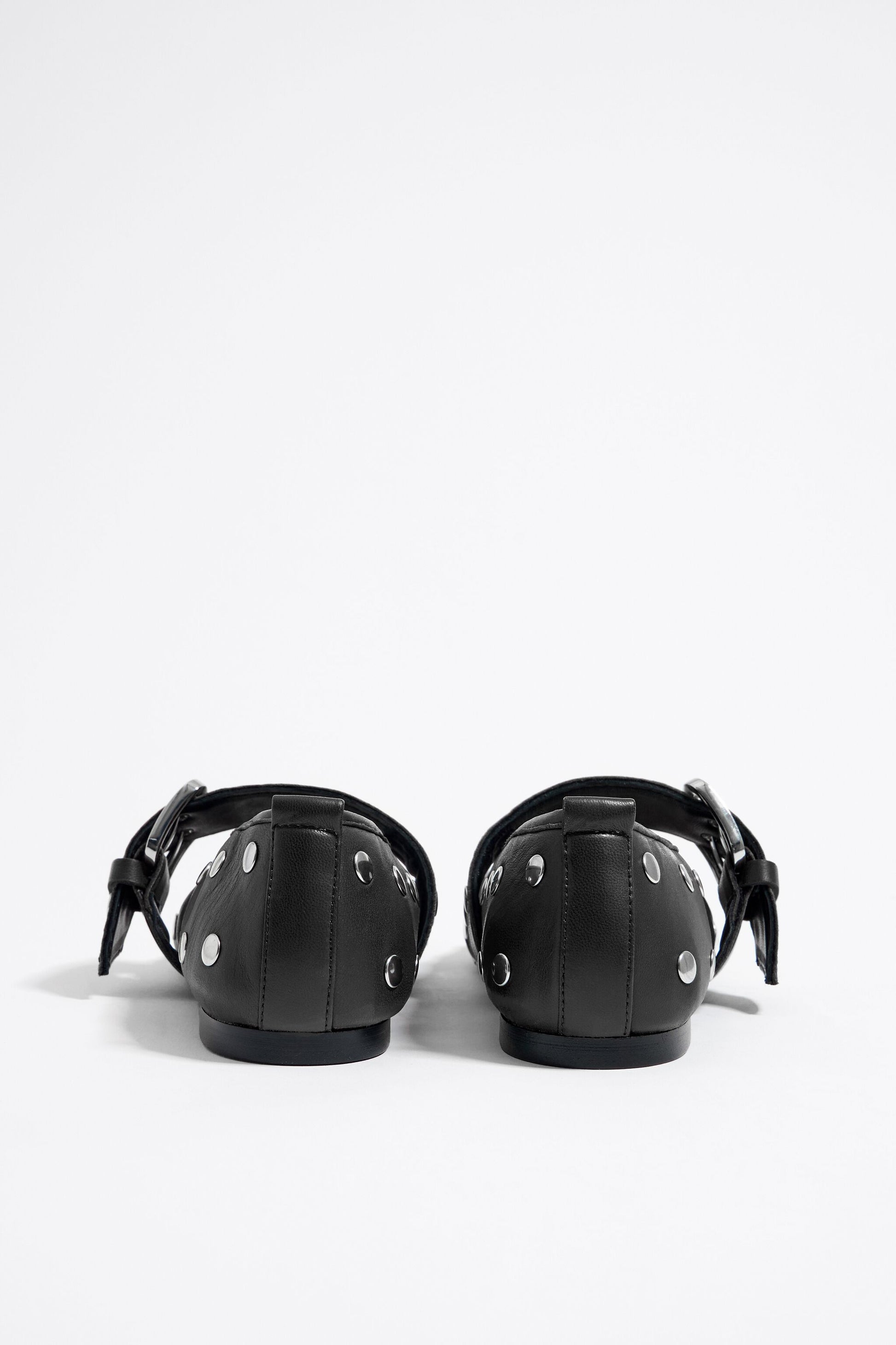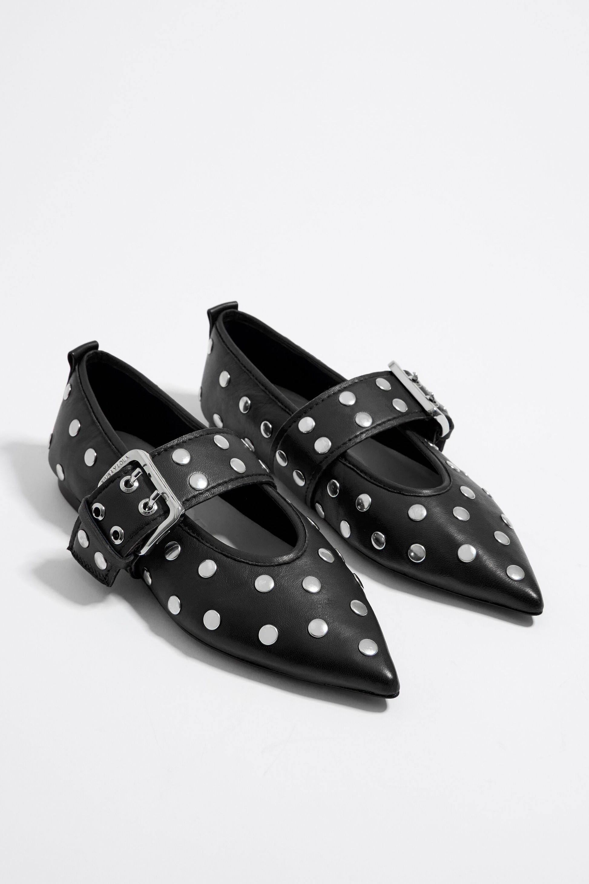 Studded leather ballerina in black. Pointed toe with adjustable strap over the upper and double-prong buckle. Leather insole with engraved logo and customized sole.