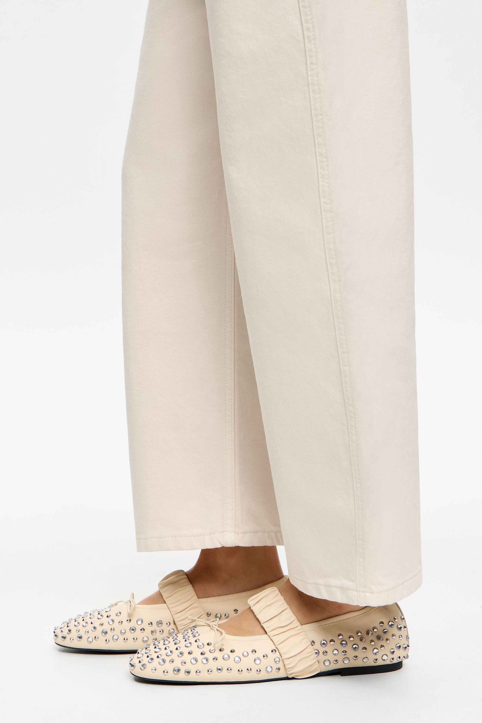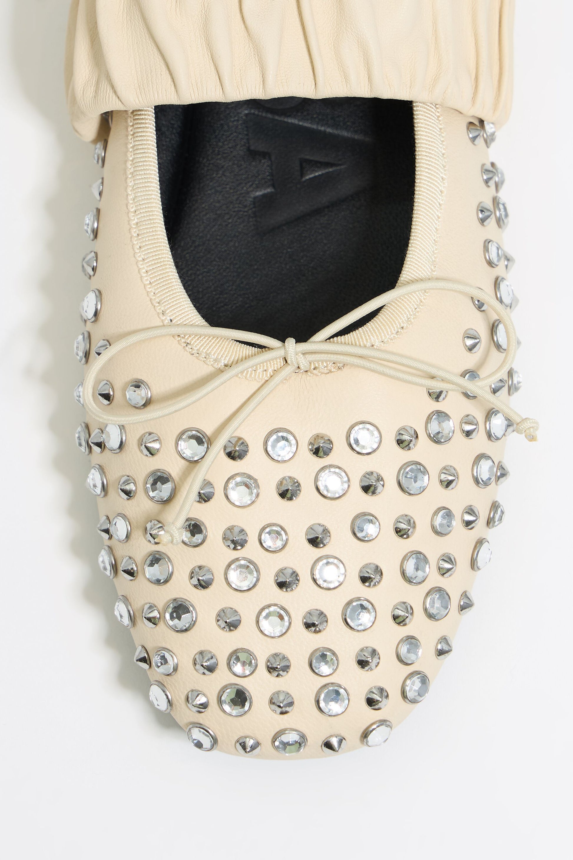 Leather ballerina in ivory with studs. Rounded toe with a leather ankle strap, V-shape vamp with stretch bow and studs with pointed crystals. Insole with engraved logo and logo sole.