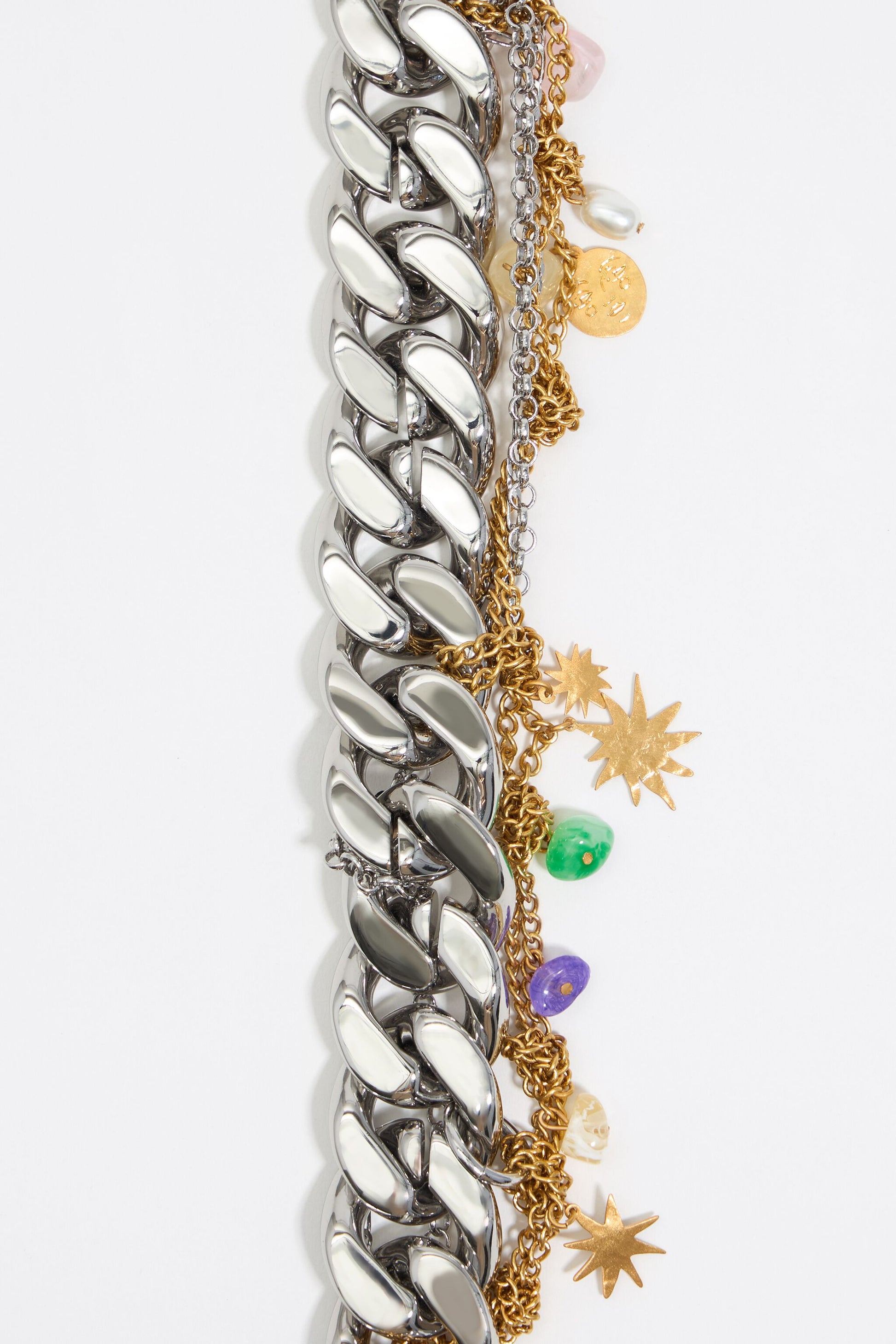 Layered chain ankle bracelet in gold and silver tone metal with sun and moon pendants. Model customized with engraved logo.
