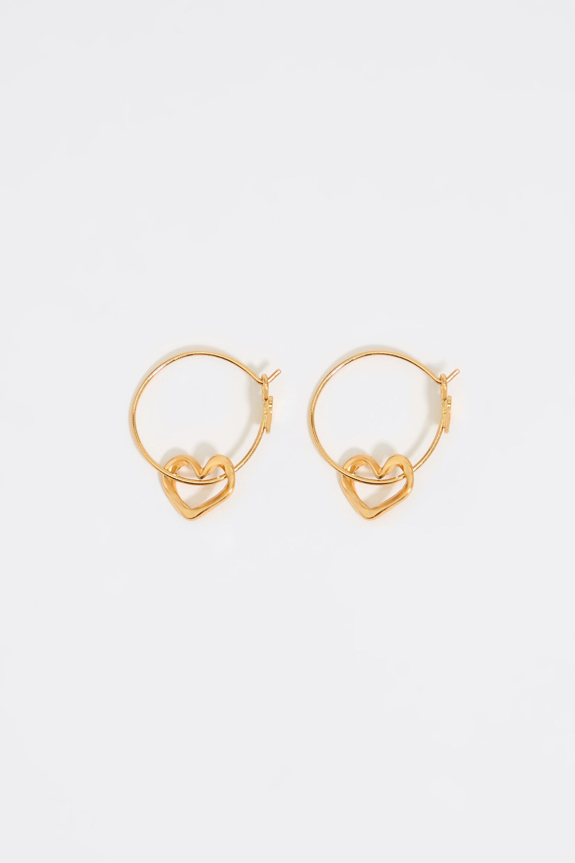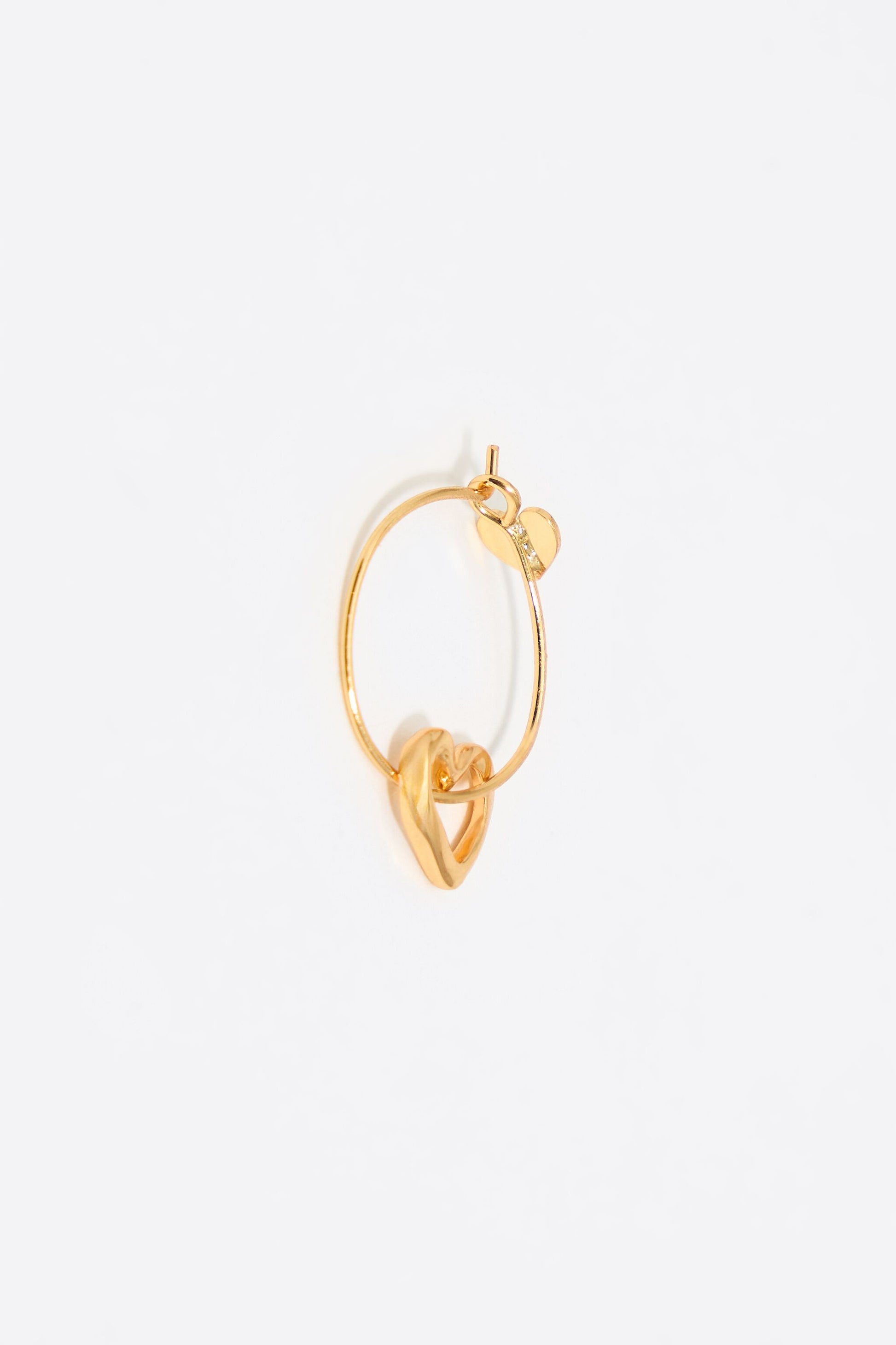 Gold metal hoop earrings with textured heart-shaped piece. Model customized with engraved logo.
