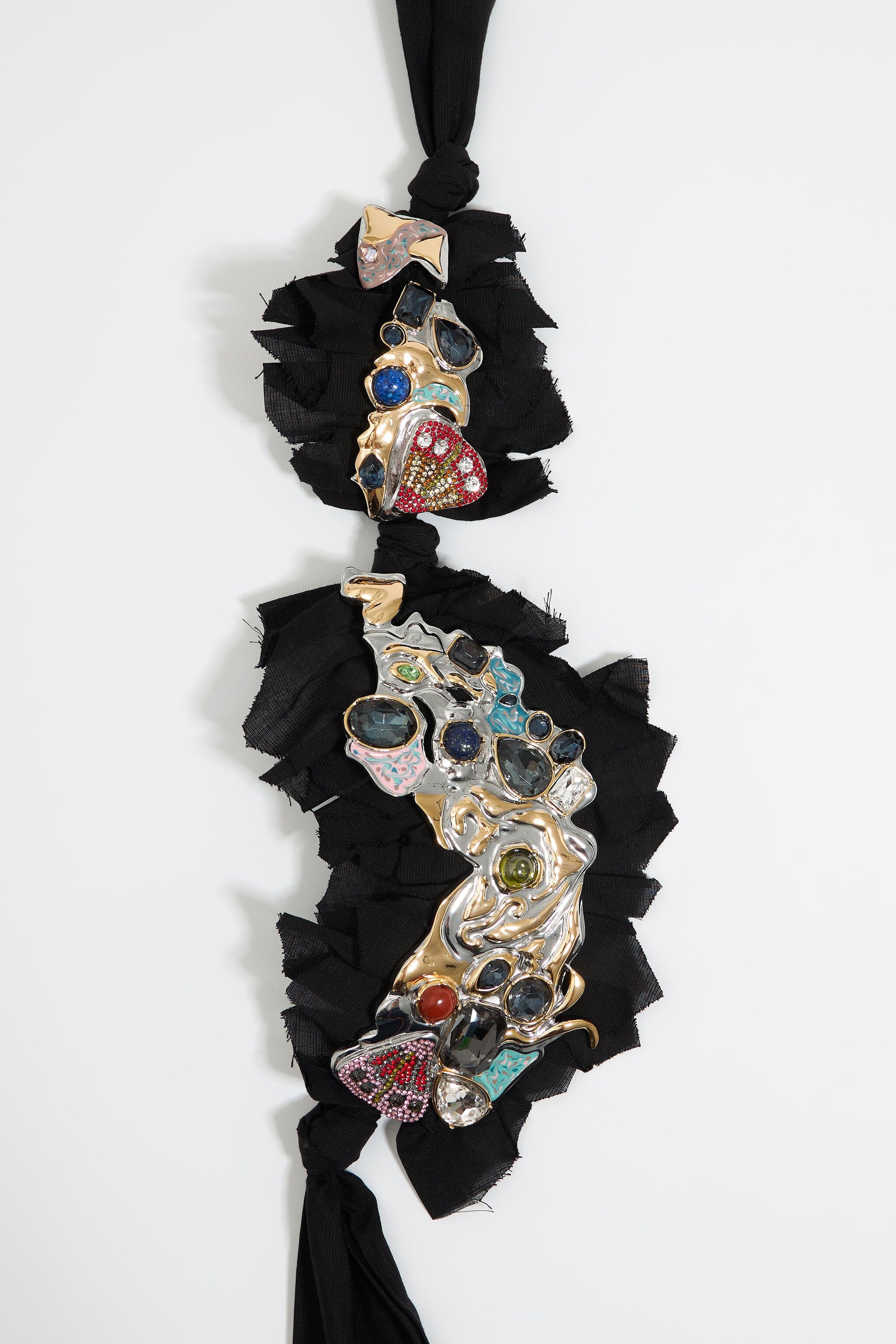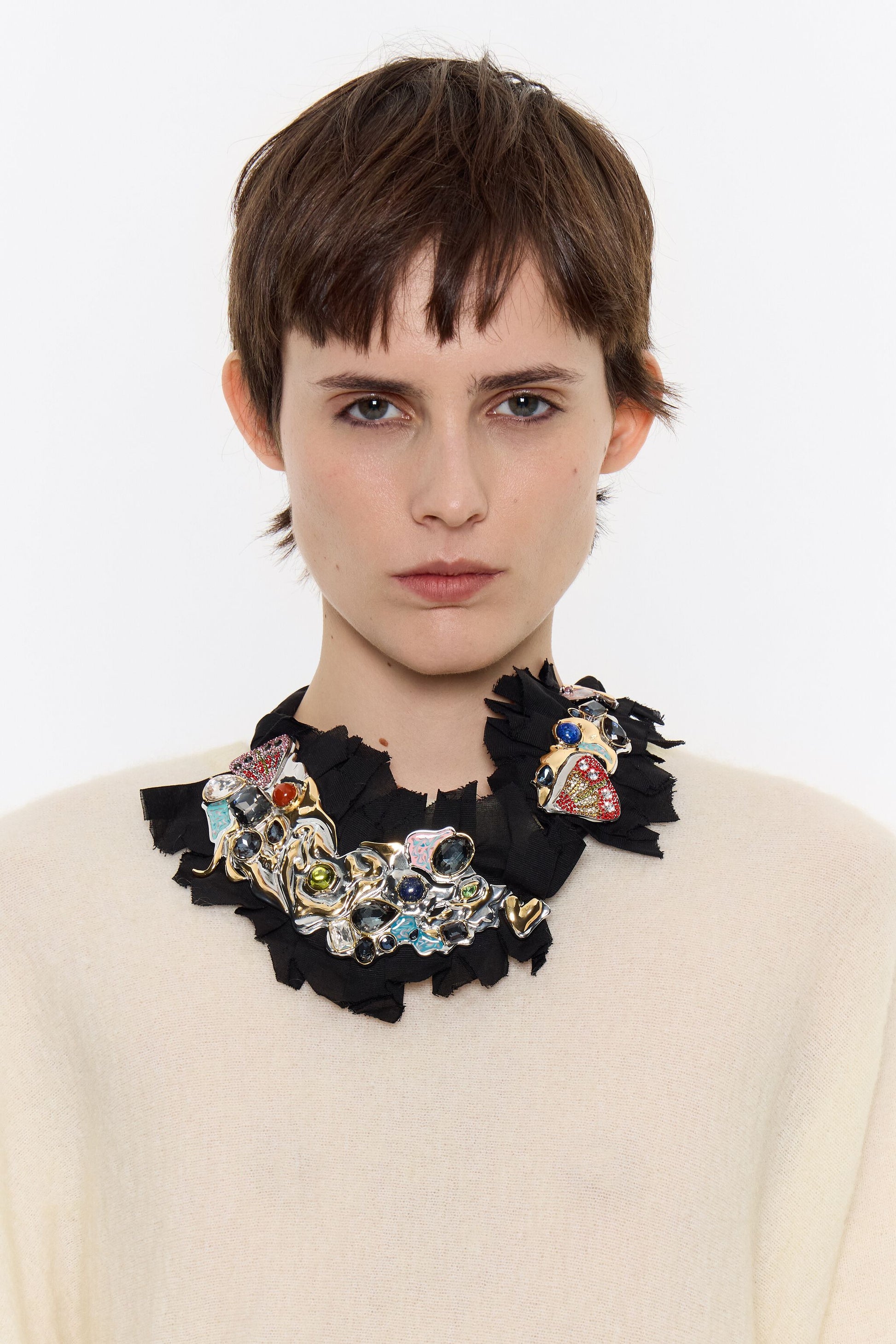 Textured necklace with crystals in dark silver. Model customized with logo label sewn into the ribbon.