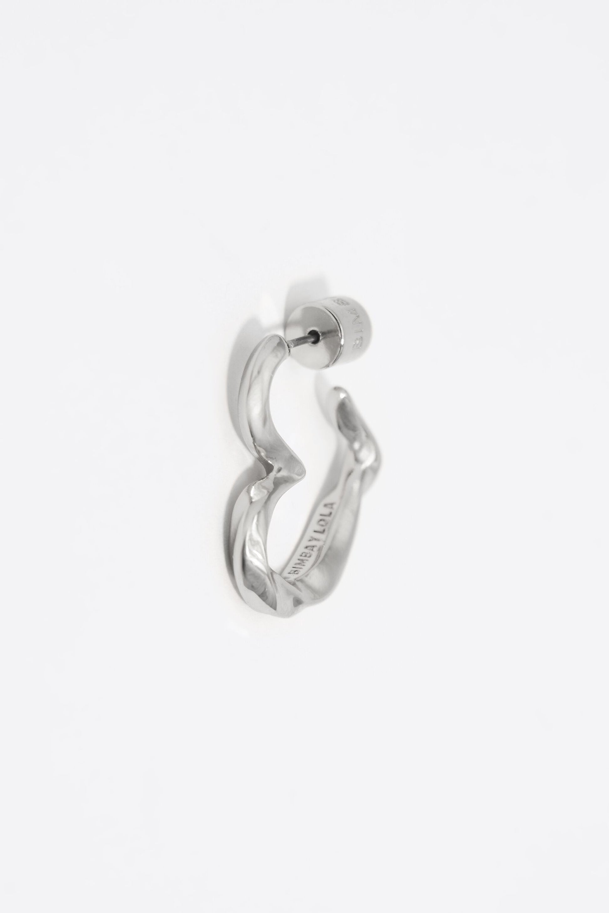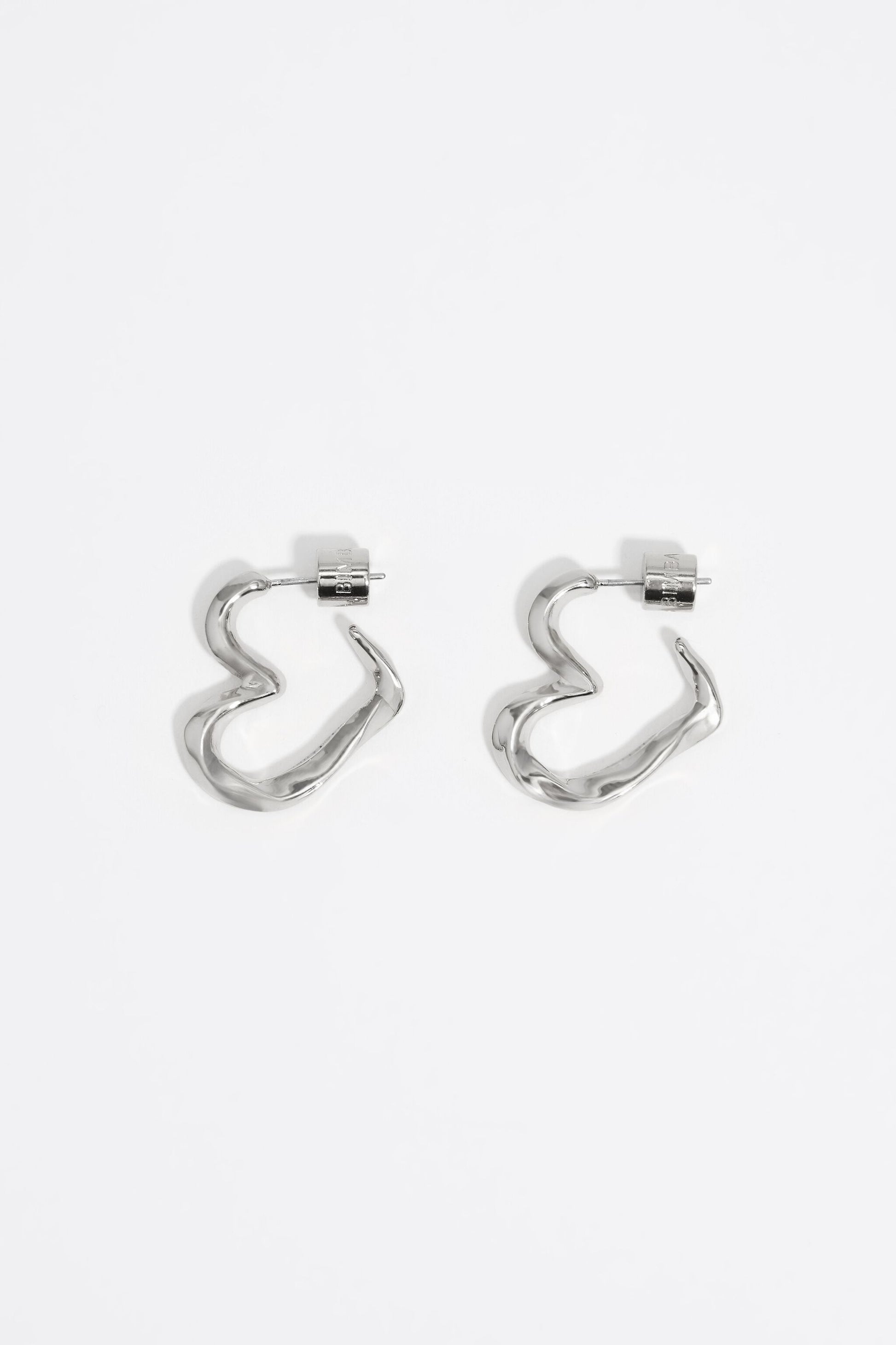 Heart-shaped textured silver metal hoop earrings. Model customized with engraved logo.
