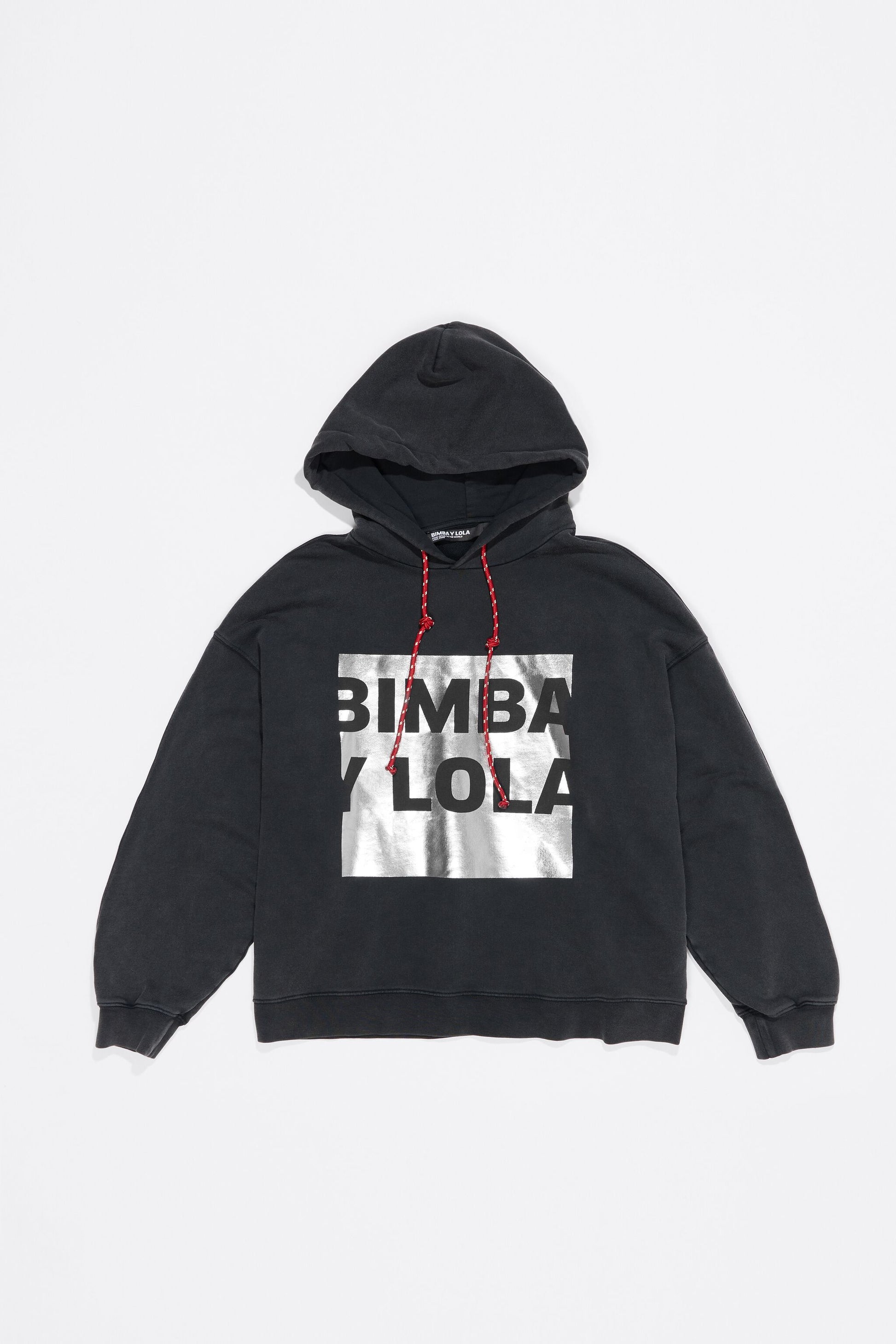 Cotton sweatshirt in washed black color. Oversize cut, with crew neck, adjustable hood with customized drawstrings, and long sleeve with shaped cuff. Exterior customized with foil logo.