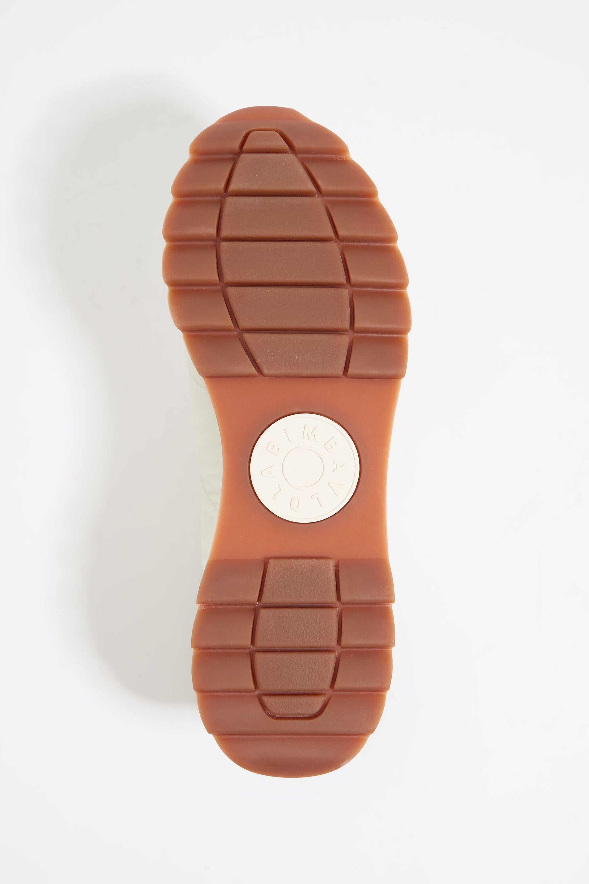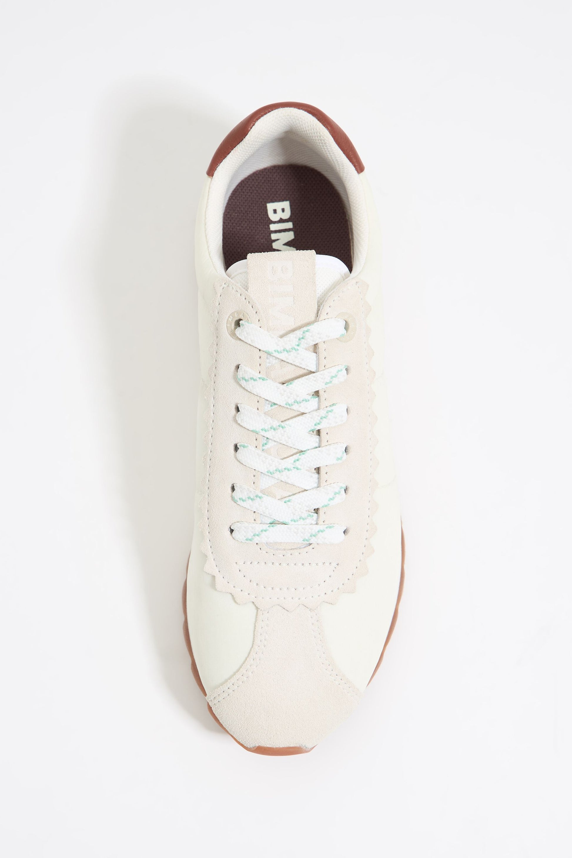 13 18 retro sneaker in white. With a mix of split leather and technical fabric pieces. Scalloped upper, side stitching, tongue with split leather label with engraved logo, and leather back with silver laminate logo. Two-tone midsole and sole with serrated finish and logo.