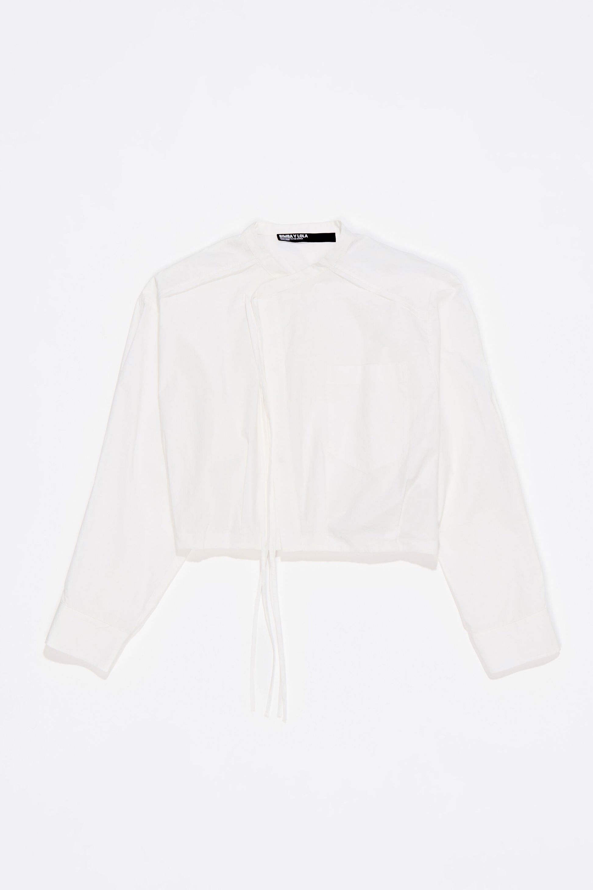 Short cotton wrap shirt in white. Balloon cut, high wrap neck with tie, long voluminous sleeve, buttoned cuffs and button-up front. Patch breast pocket, pleats at the hem and raw finish yoke.