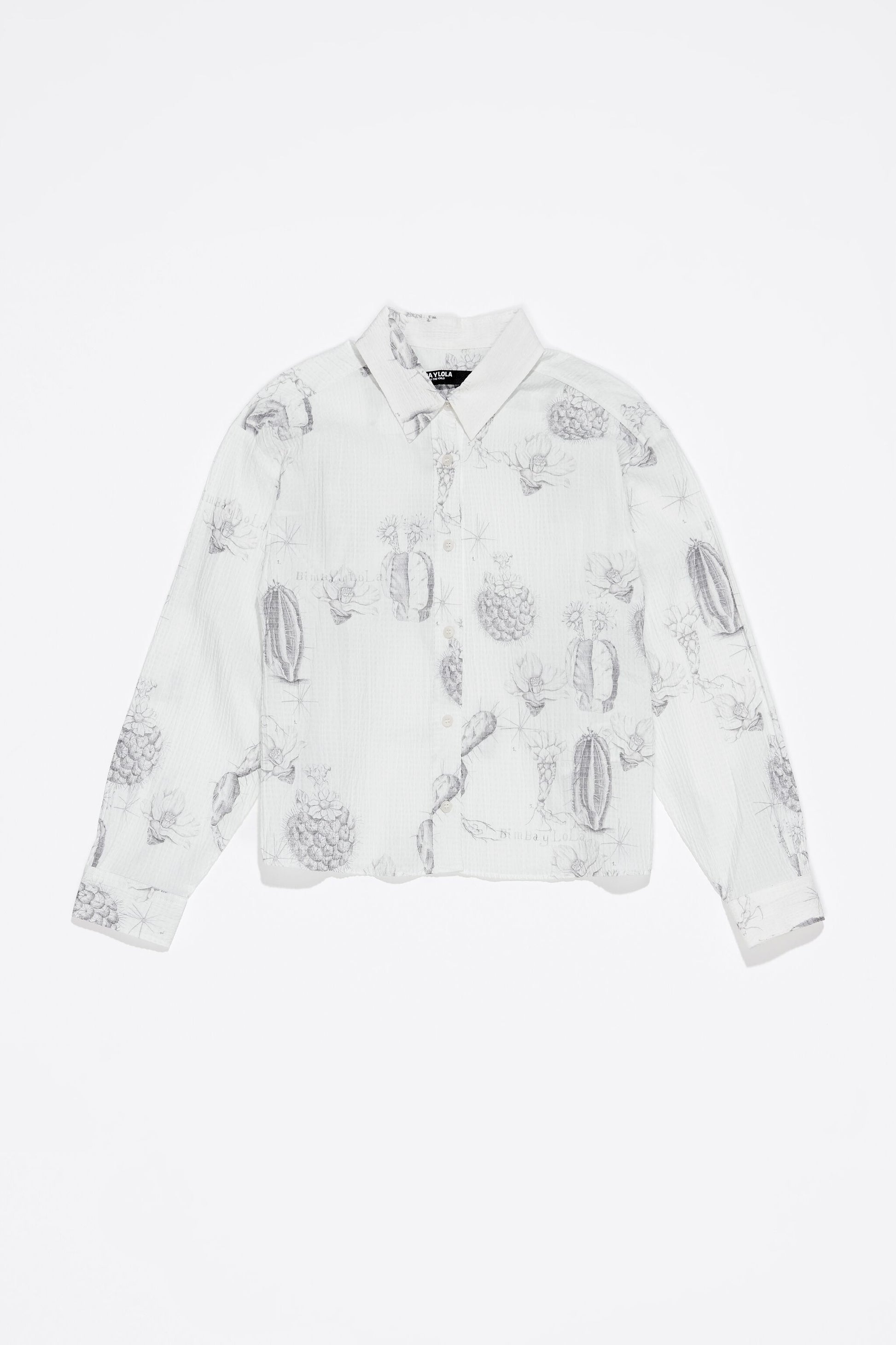 Shirt in white with Cactus Lápiz print. Boxy cut with shirt collar, long sleeve with cuff, and button-up front.