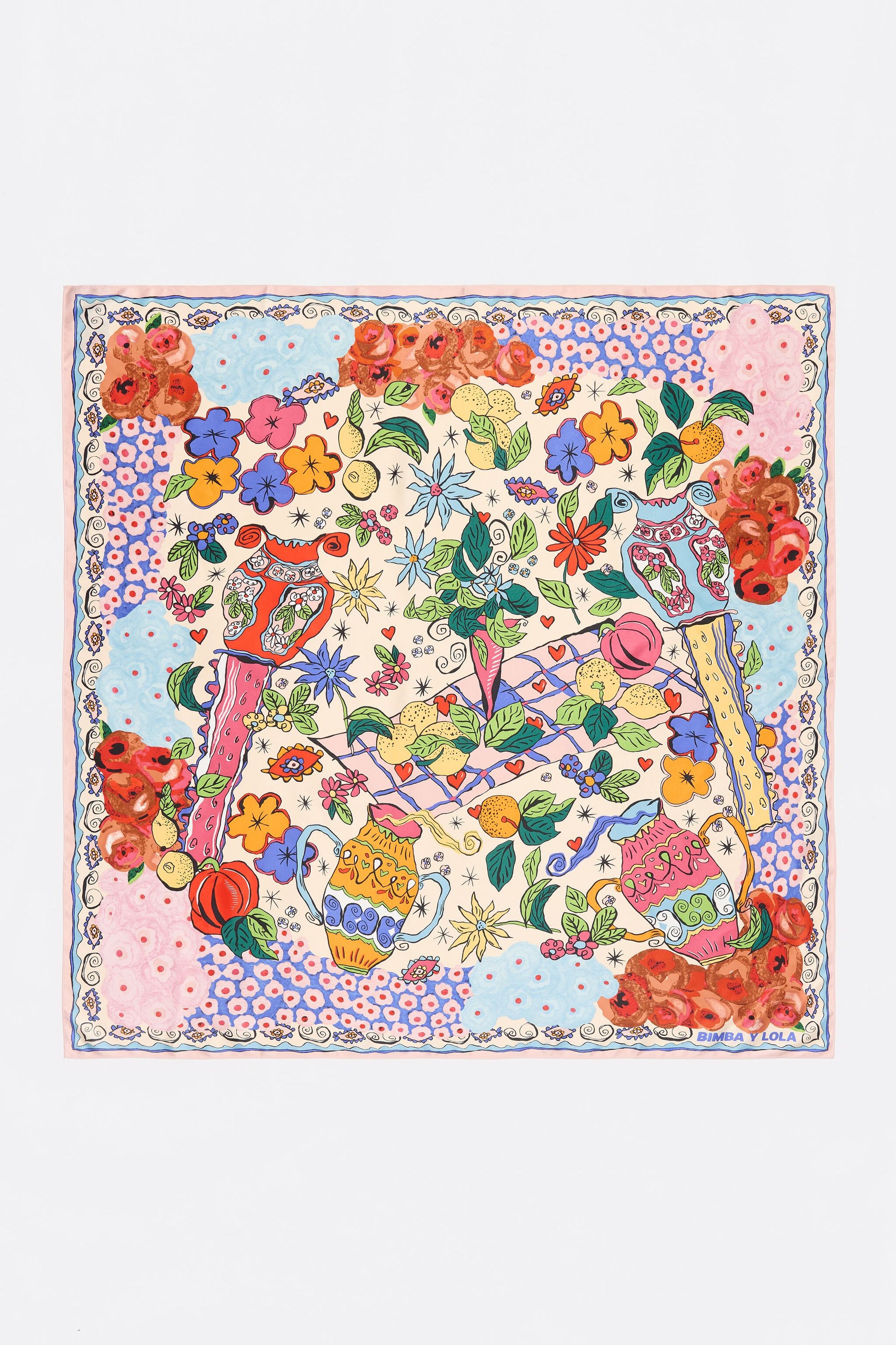 Scarf with flowers and lemons print on an off-white background. 100% Recycled polyester.