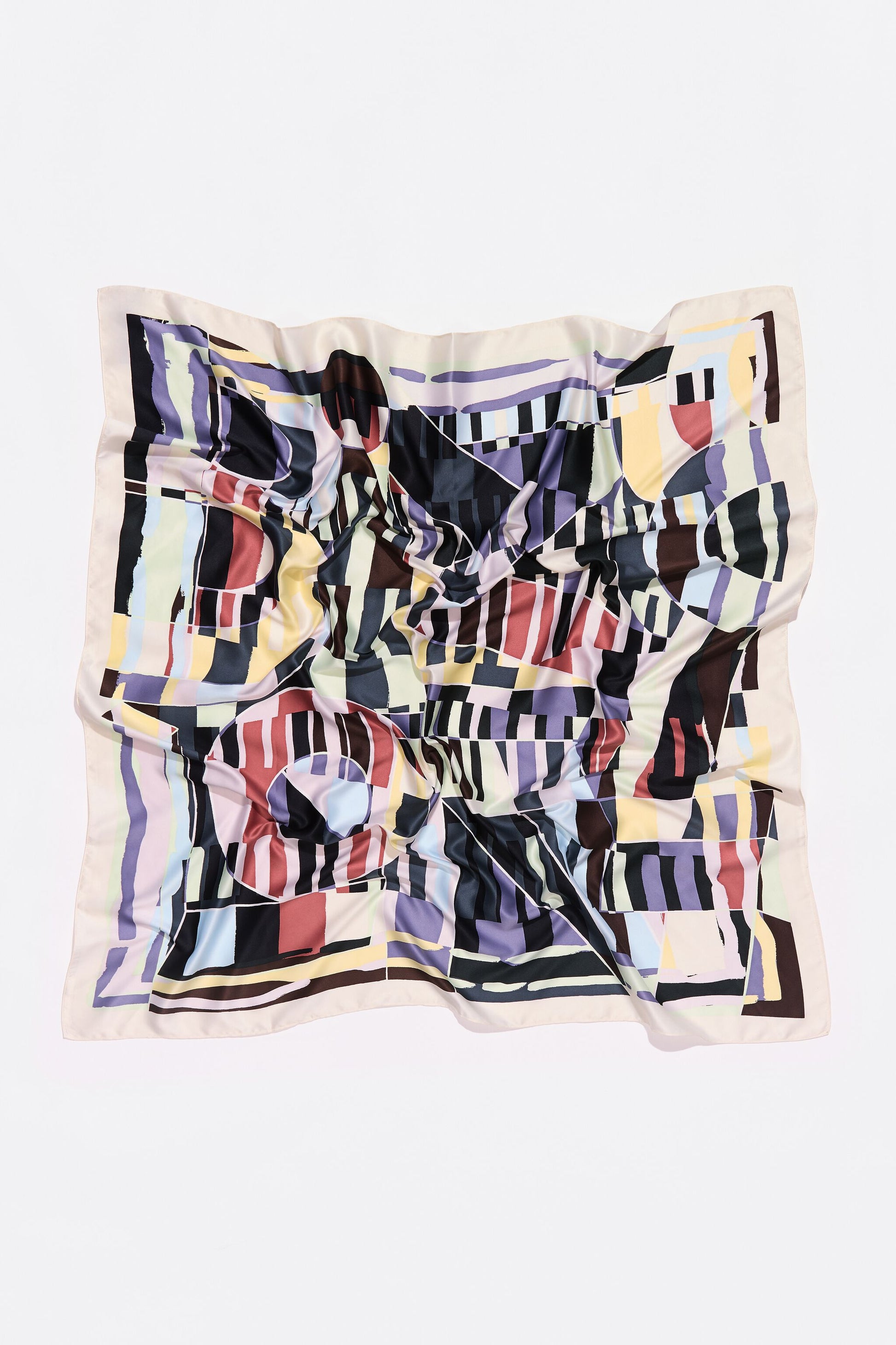 Scarf with geometric print and logo on an off-white background. 100% Recycled polyester.