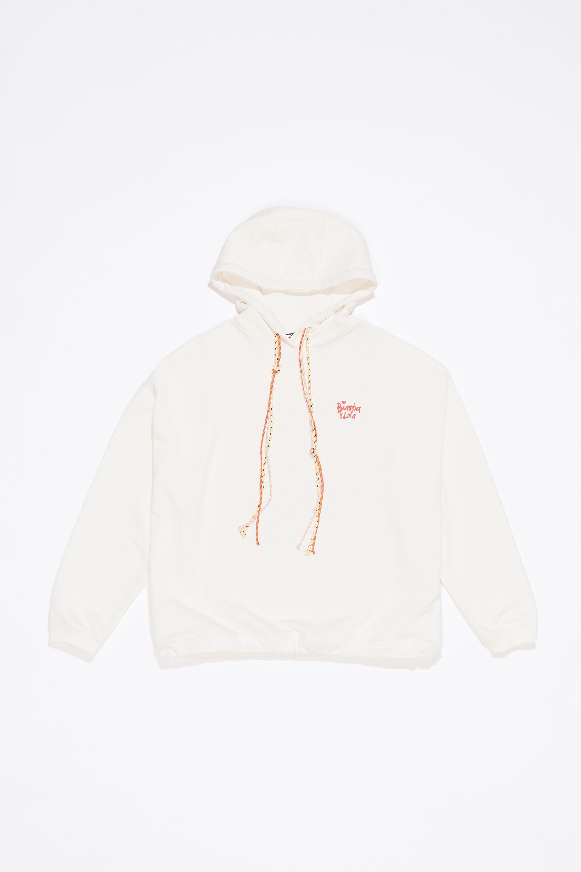 Cotton sweatshirt in off-white. Straight cut, with crew neck, adjustable hood with customized drawstrings, and long straight sleeve. Exterior customized with logo print, elastic hem with stoppers.
