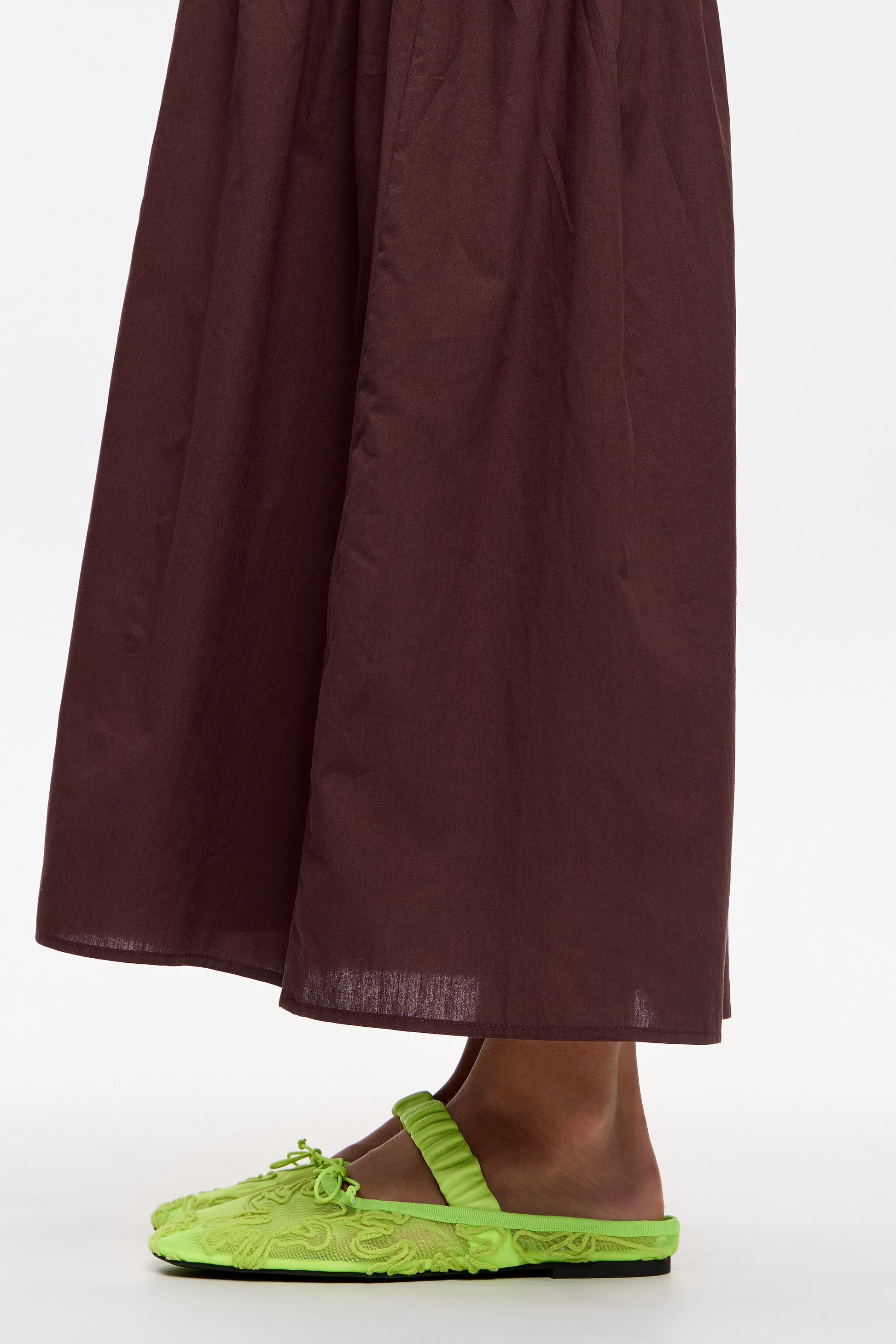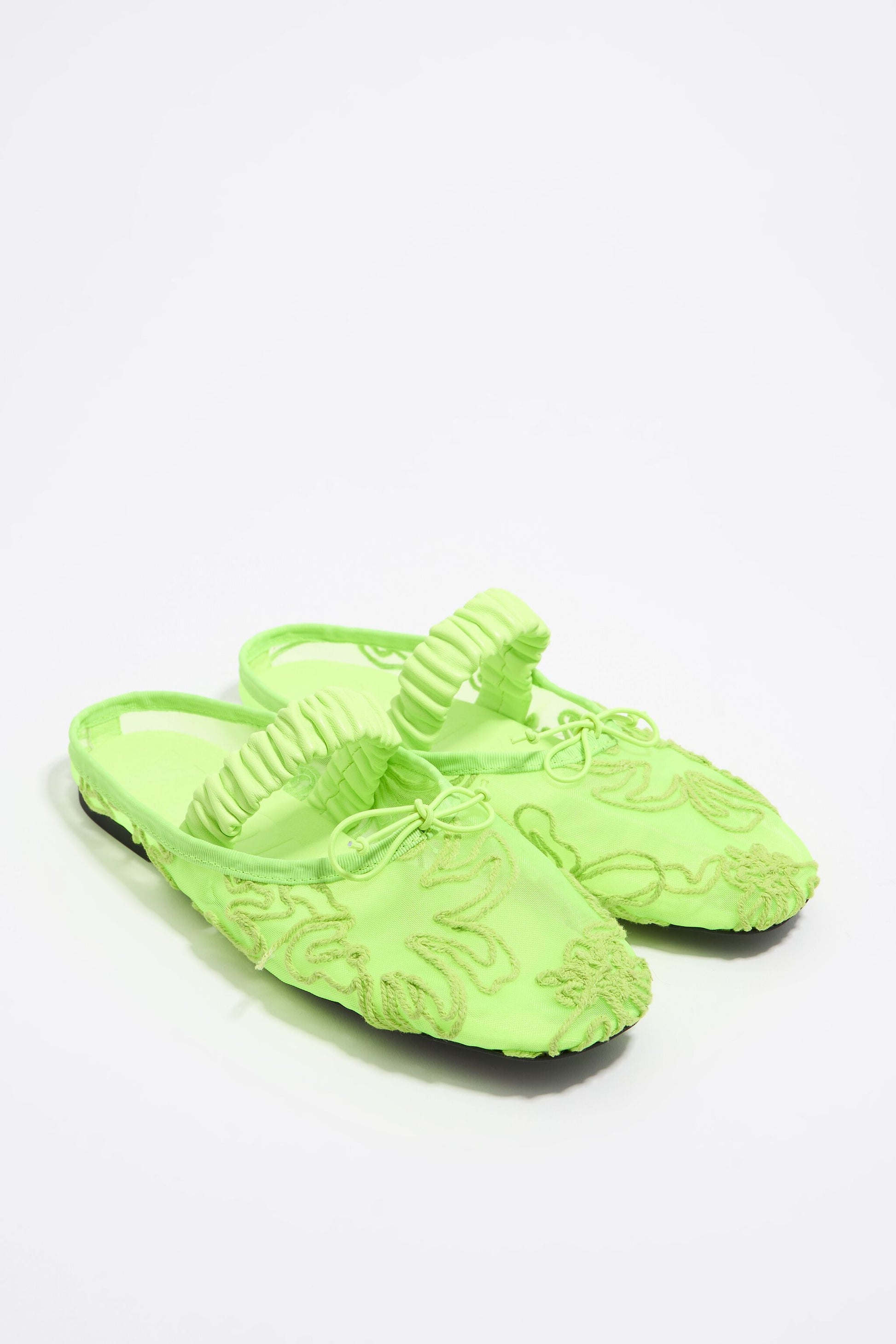 Embroidered mosquito net slingback ballerina in neon yellow. With round toe and tonal elastic strap. Insole with engraved logo and rubber logo sole.