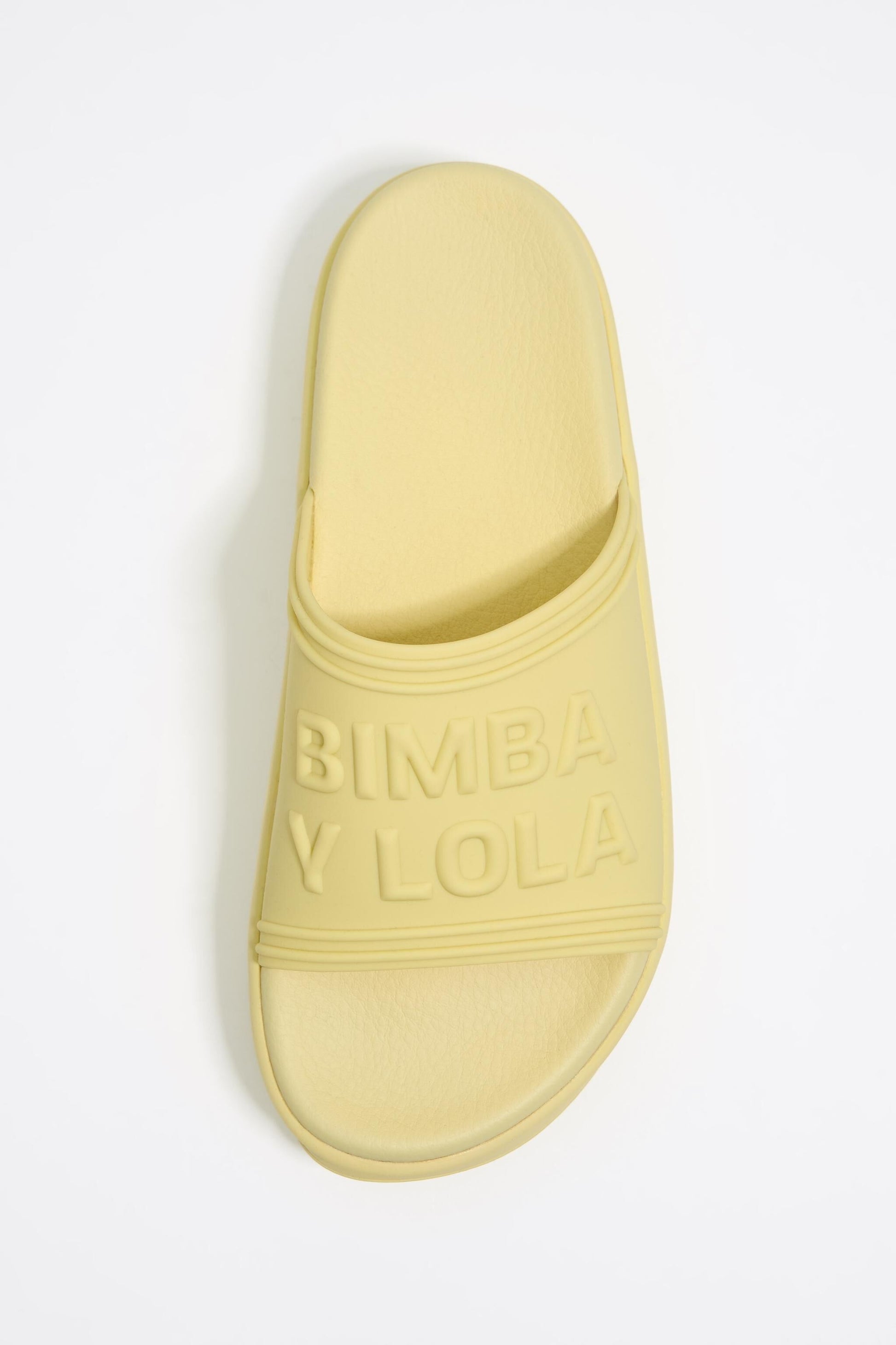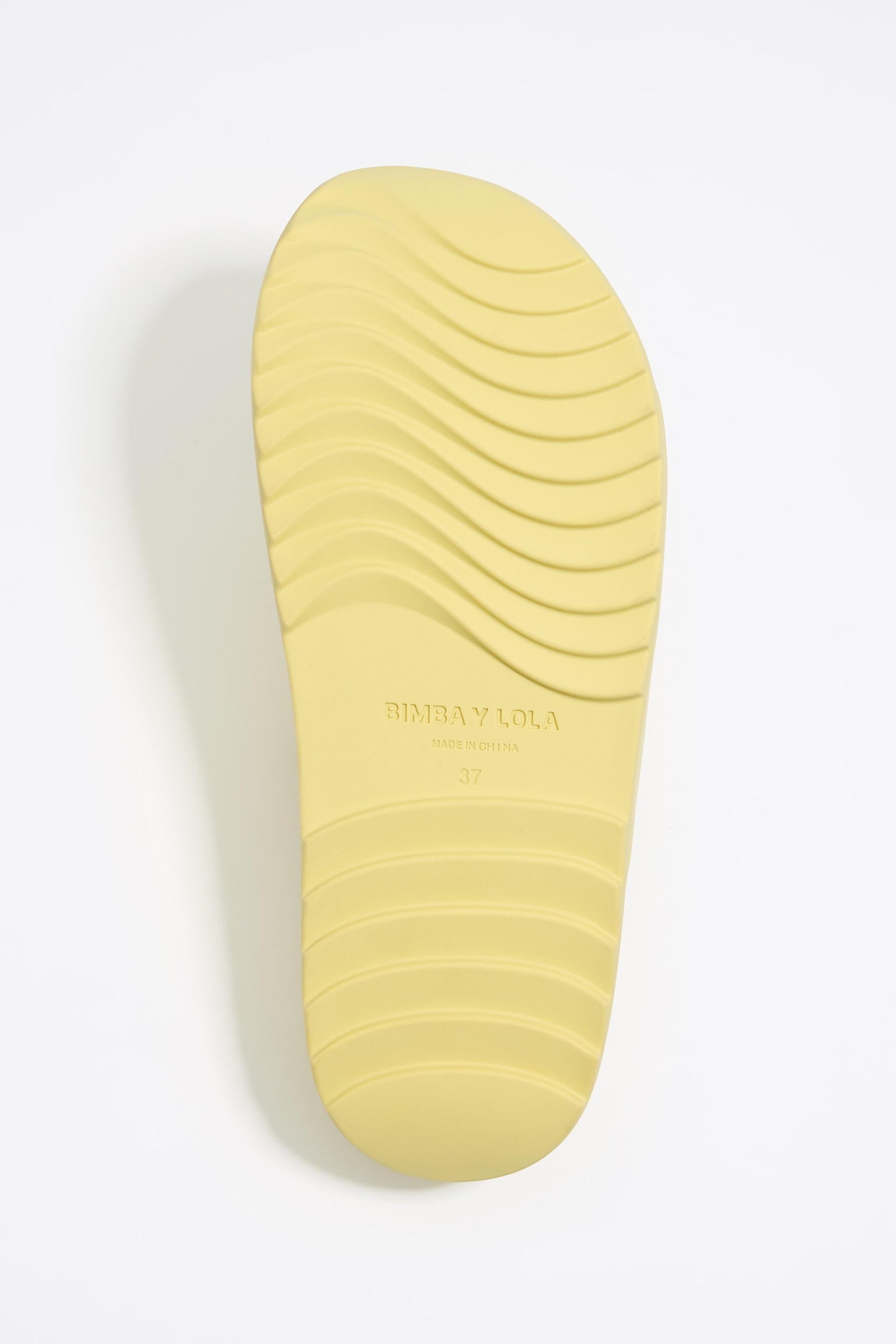 Platform slider in yellow with organic lines. Model with logo strap. Logo sole with serrated finish.